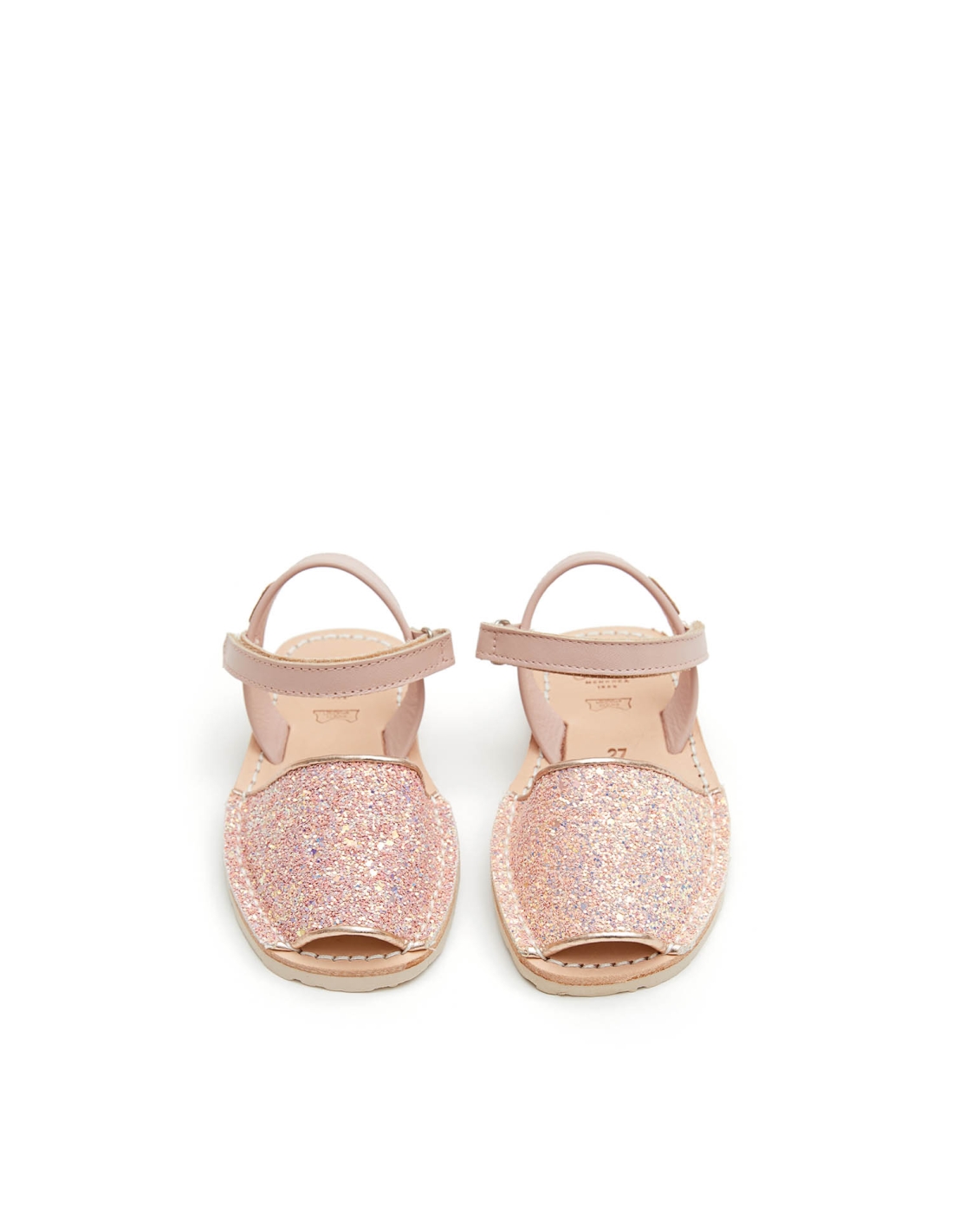 Avarca infantil amb purpurina. Tira posterior agafada en el turmell amb un velcro. Pala de gliter folrada. Pala cosida a la plantilla. Plantilla de pell. Sola de goma color ivori amb alça en el taló.