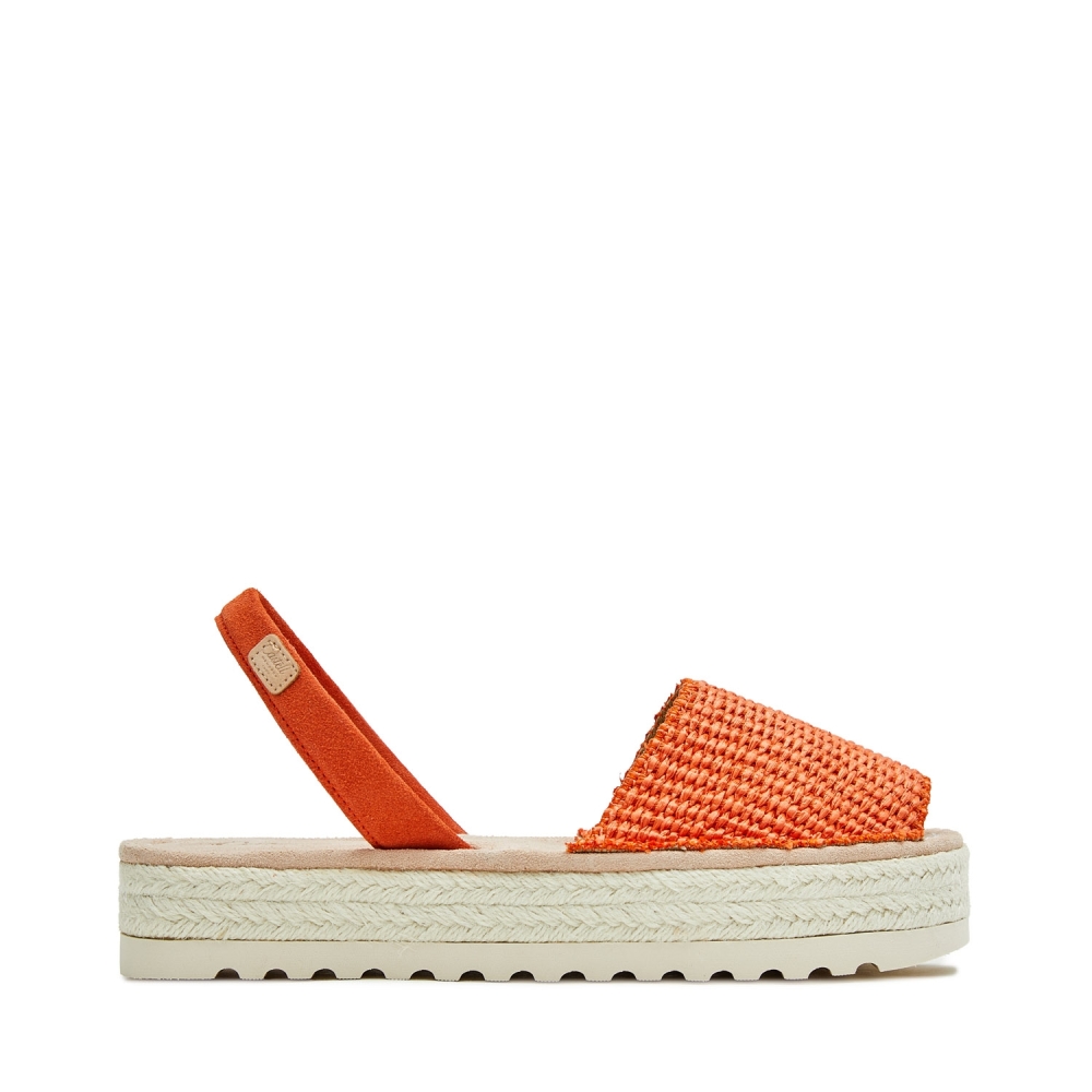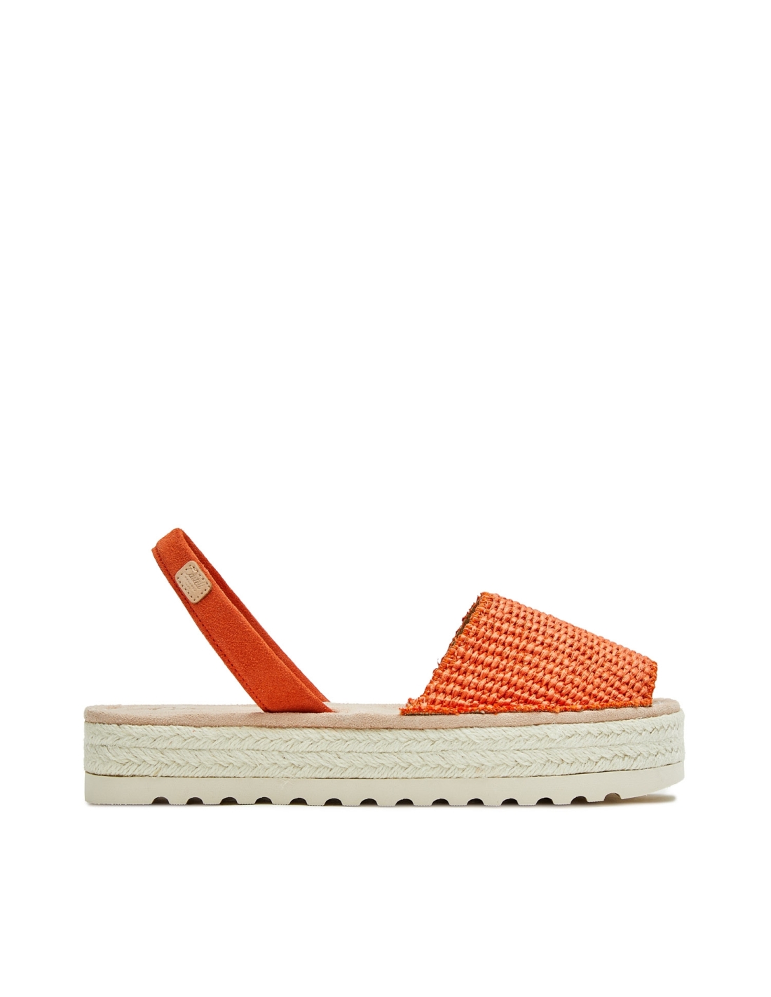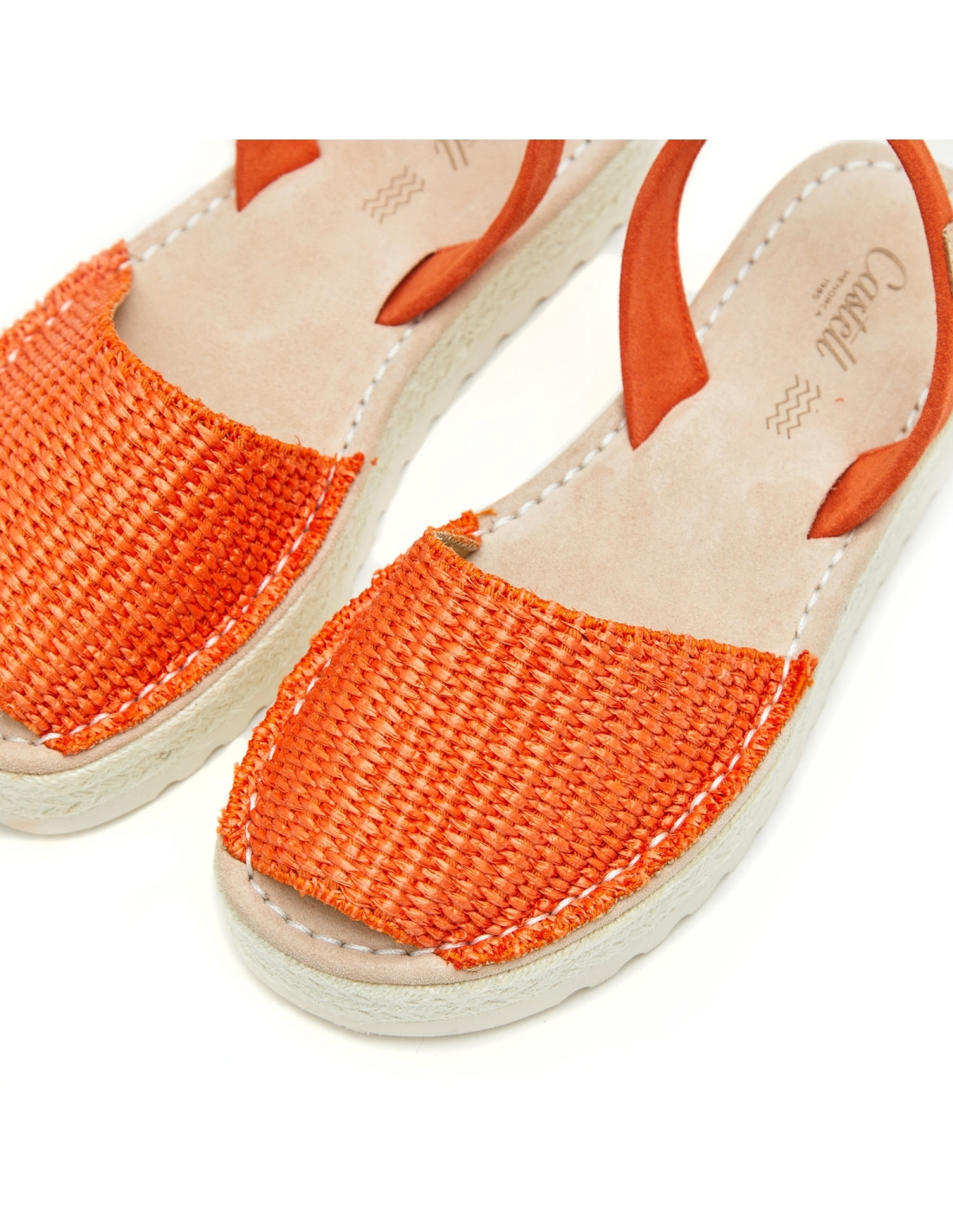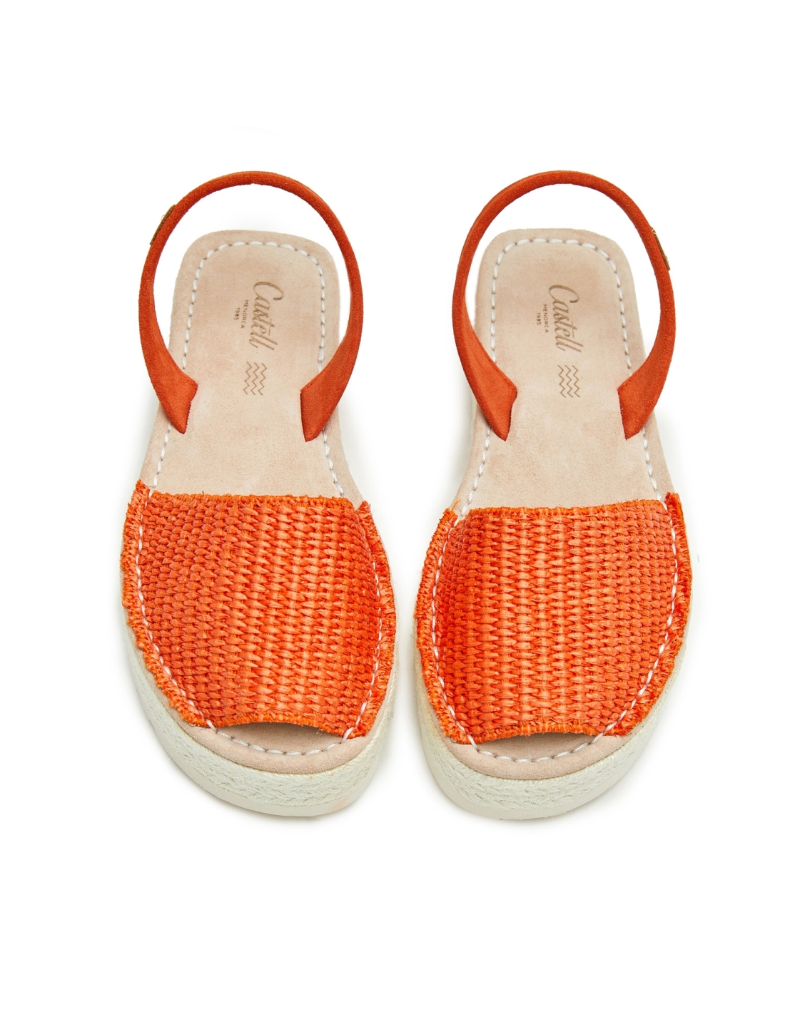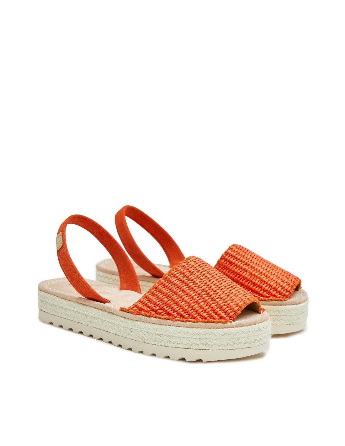 Avarca Menorquina de Ràfia. Pala folrada i cosida. Plantilla embuatada. Plataforma de doble jute de 3 cm d'altura acabat en goma color ivori.