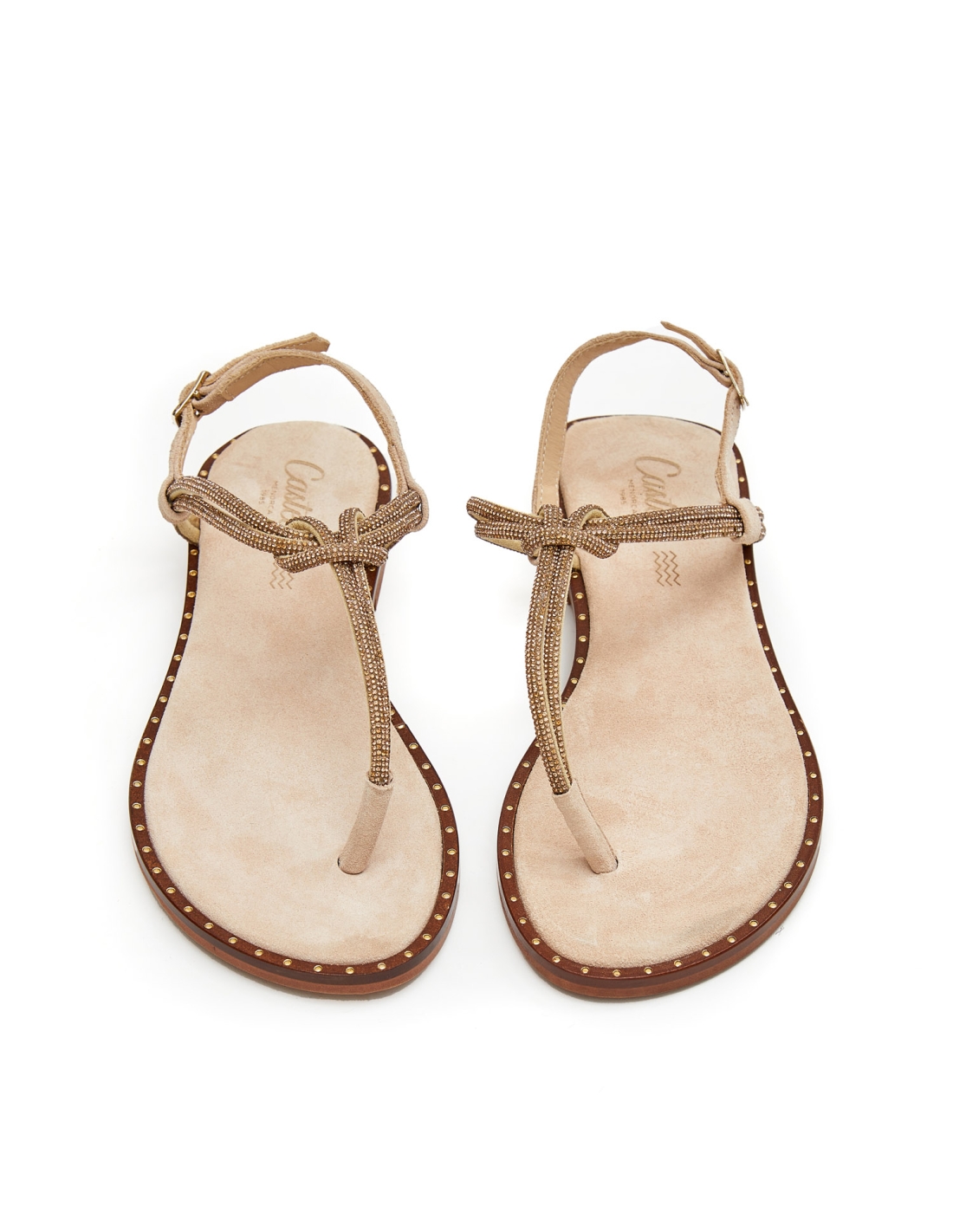 Sandàlia plana elegant amb brillants. Fabricada en pell. Tancament en el turmell amb sivella. Detalli tatxes metal·litzades. Plantilla folrada de pell de serratge.