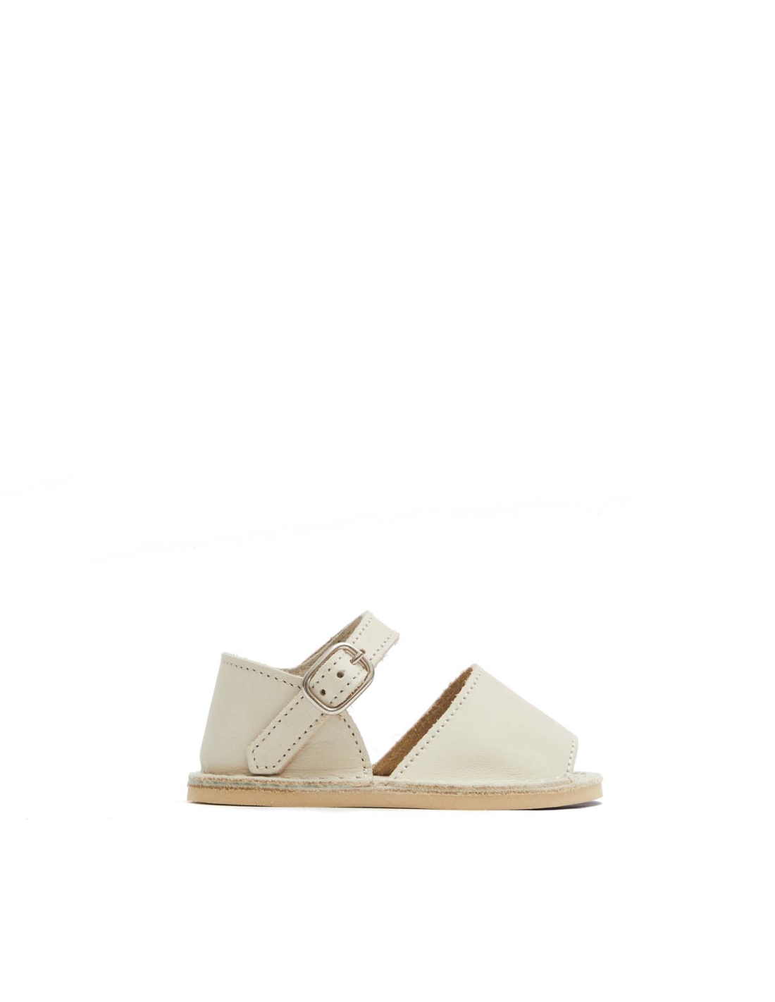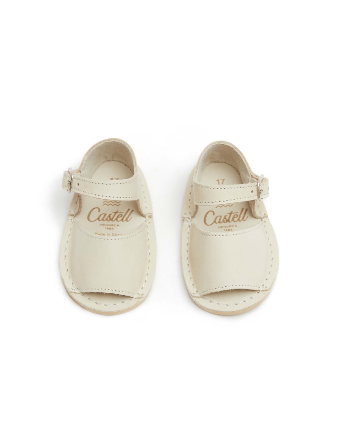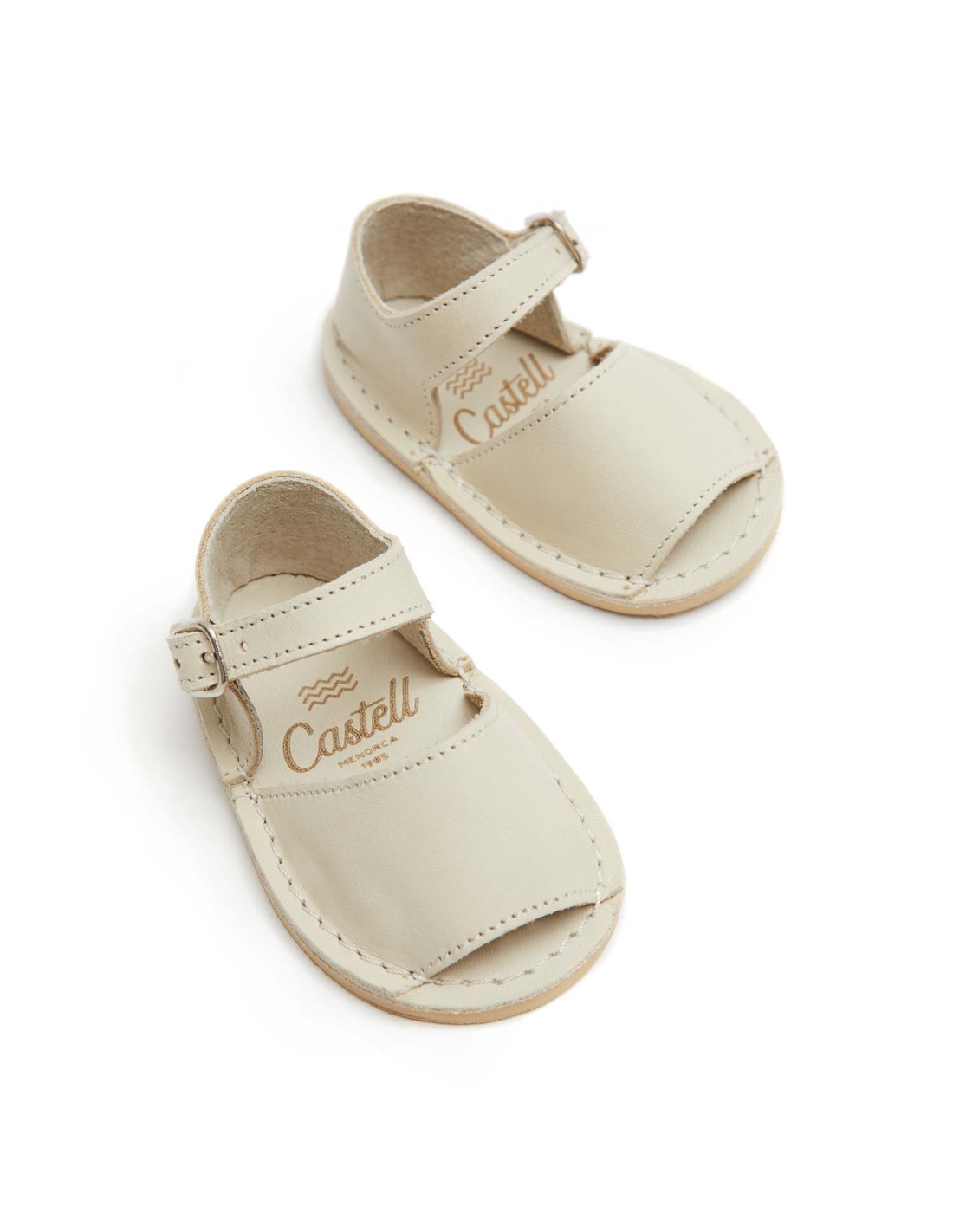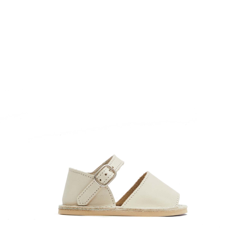 Abasta Menorquina de bebè. Fabricació elaborada amb pell suau. Pala i talonera cosides a la plantilla. Talonera lligada al turmell amb una polsera de pell suau i petita sivella rectangular platejada. Plantilla de pell. Pis micro beix súper flexible. Pis 4 mm