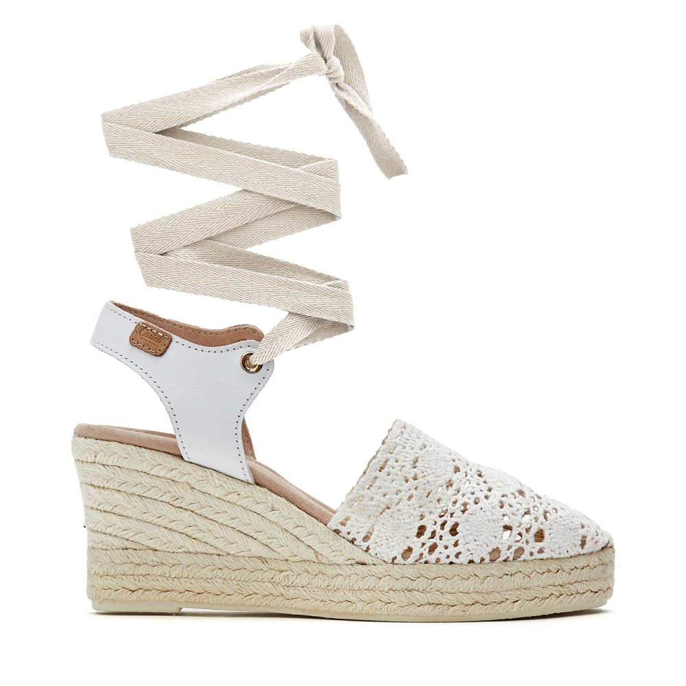 Descripció principal: La sandàlia Mari combina l'encant artesanal del ganxet amb l'alçada perfecta de la seva cunya de 7 cm. Disponible en blanc o negre, i amb llaçada al turmell, és un model femení, estilitzat i còmode. Ideal per a looks estiuencs i frescos.
