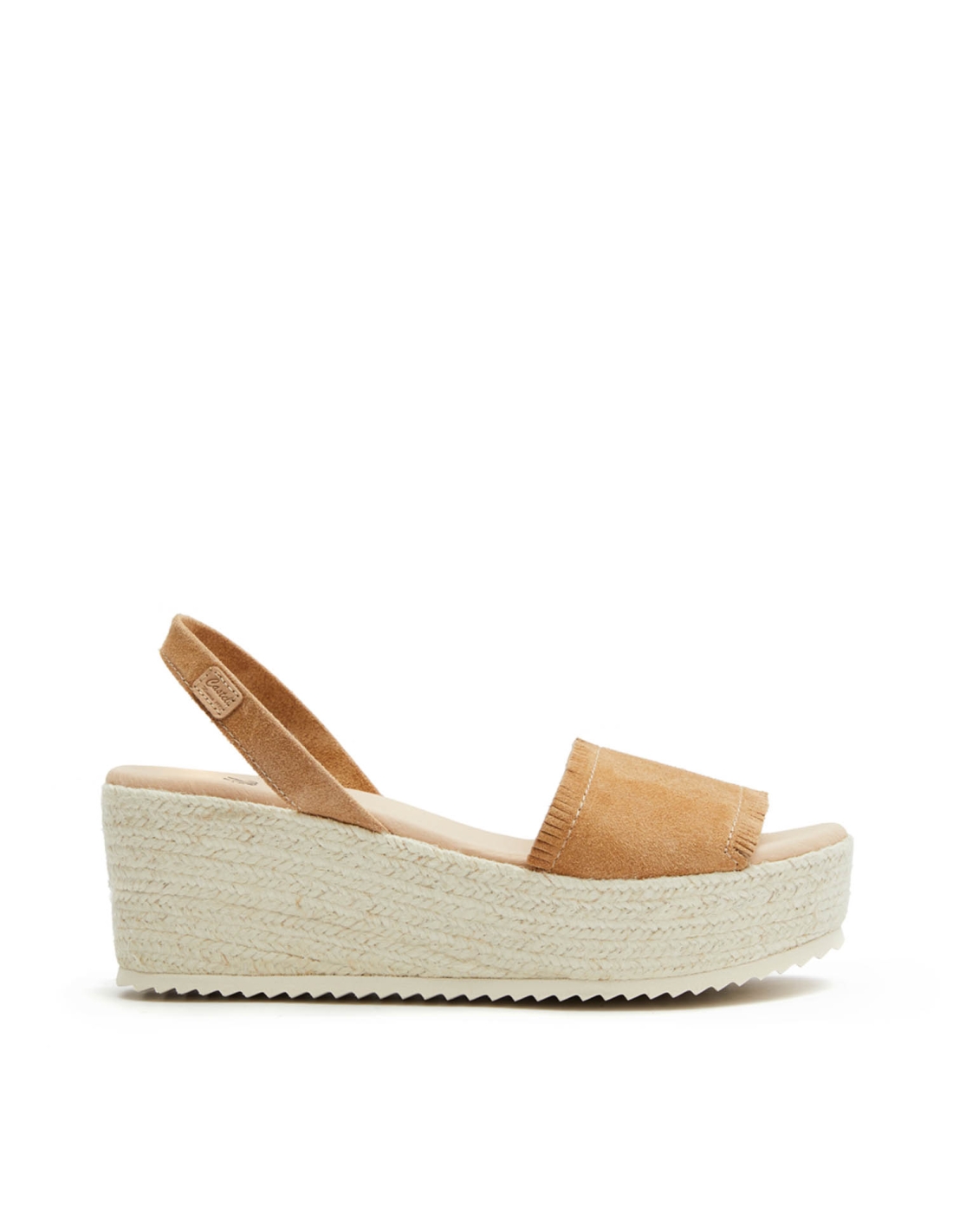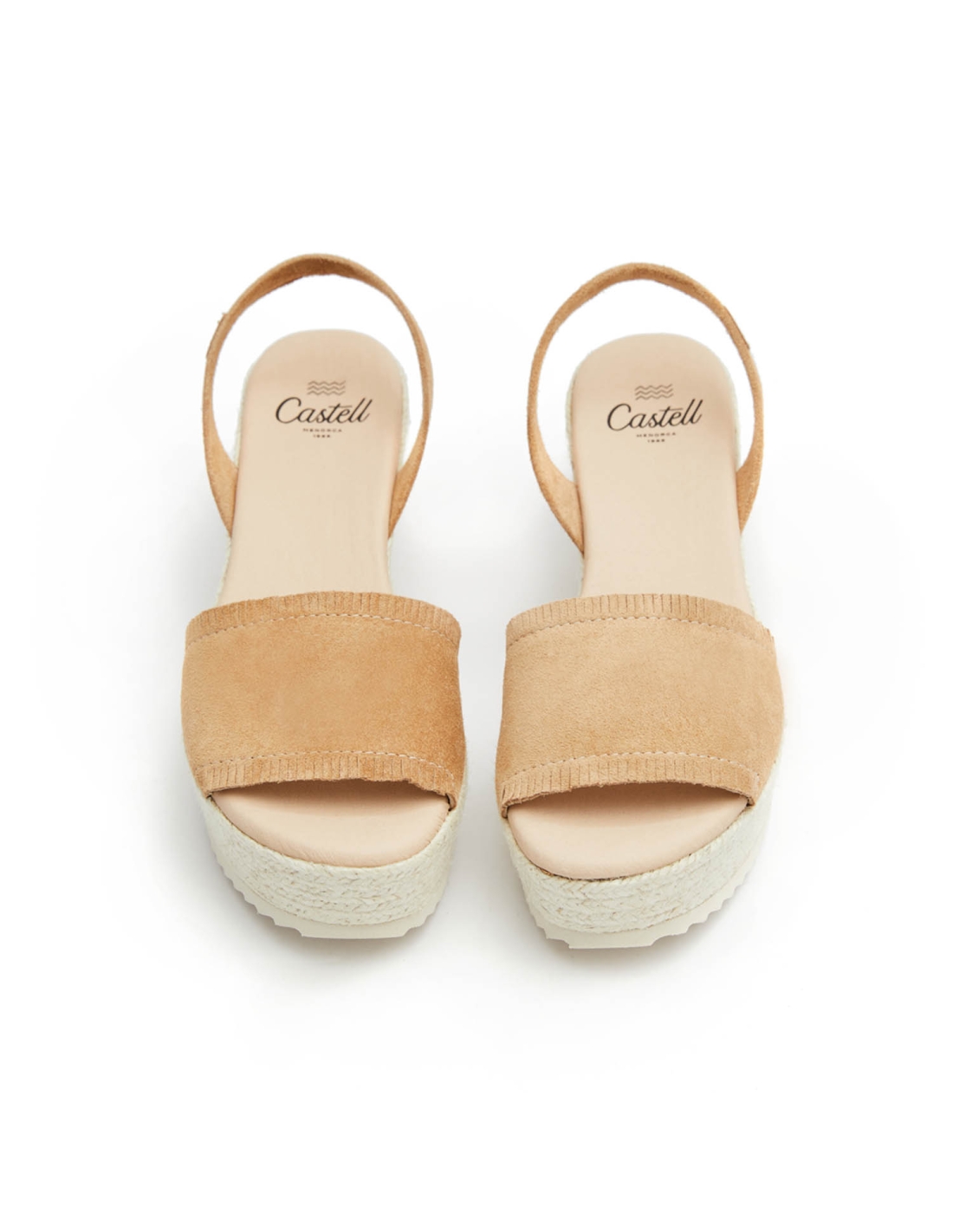 Avarca amb falca de jute de 6,5 cm d'altura. Pala de serratge italià de 1a qualitat, folrada i acabada en serrell cosida amb fil al mateix to que la pell. Plantilla embuatada i sola de goma color marfil. Aquest model, gràcies al la forma i el serrell, té un calç més ample que la resta de sandàlies Castell, ideal per a peus normals o una mica més amples.