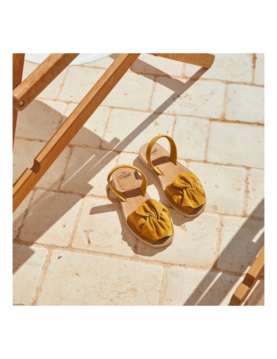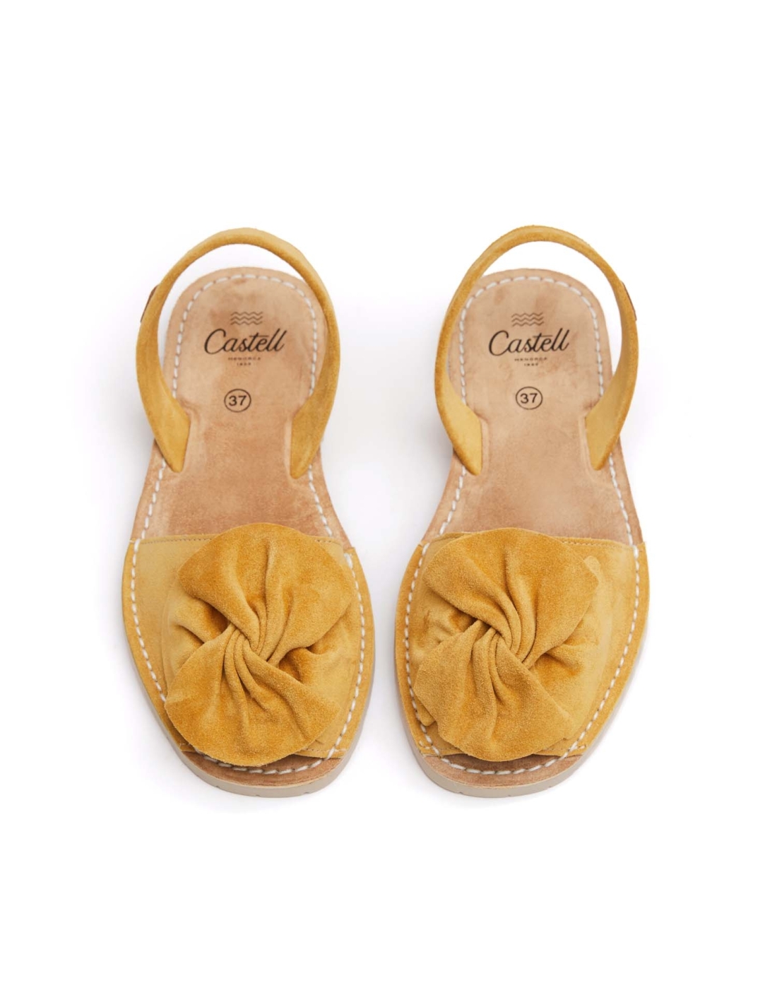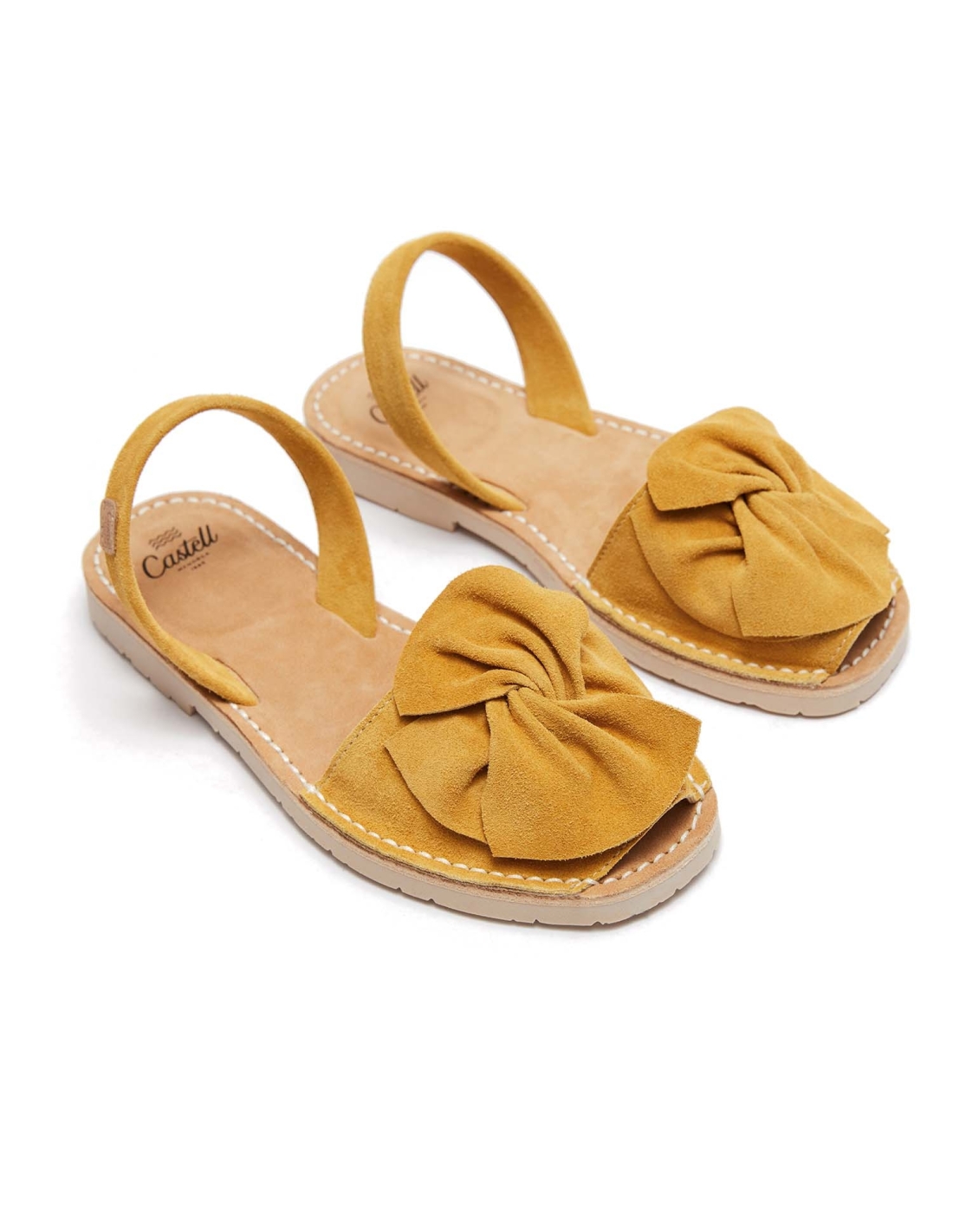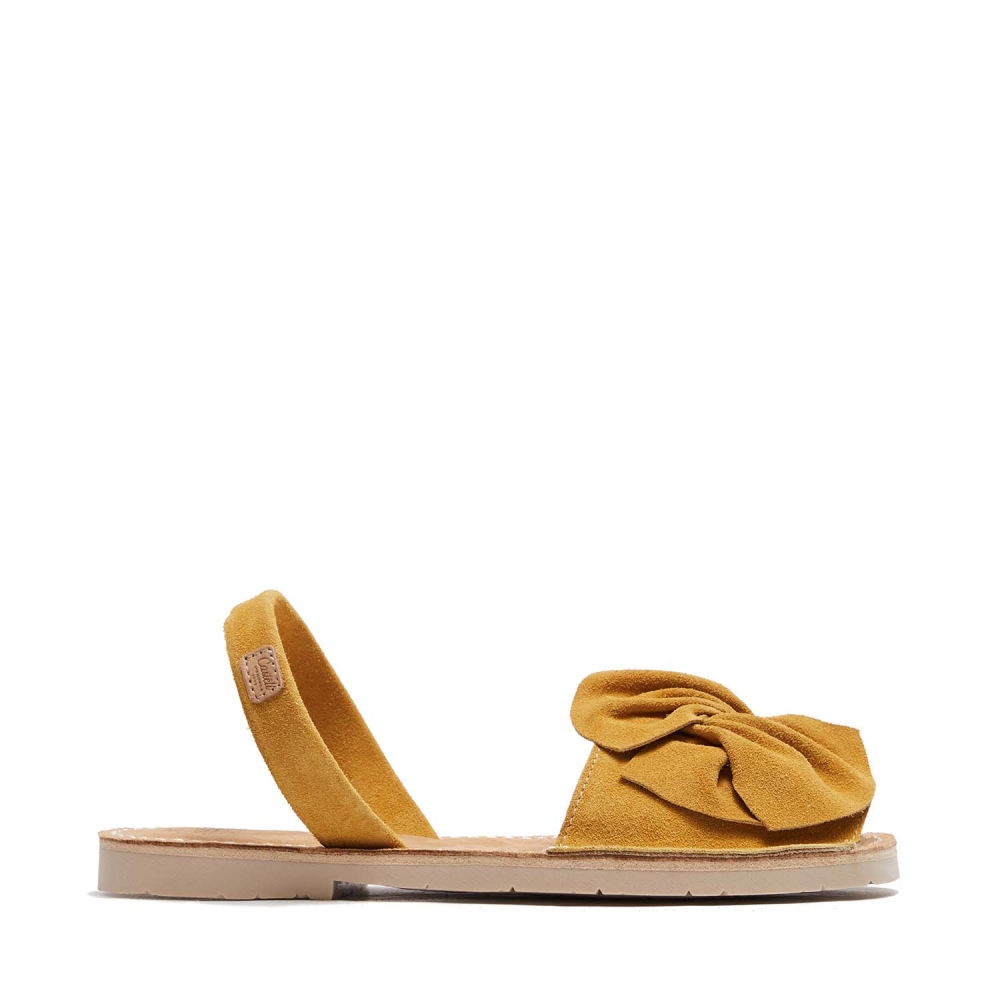 Menorquina amb adorn en forma de llaç. Pala de serratge italià de 1a qualitat i folrada de pell. Plantilla de pell de serratge embuatada, sola de cautxú de color ivori amb una petita alça, altura d'1.5 cm.