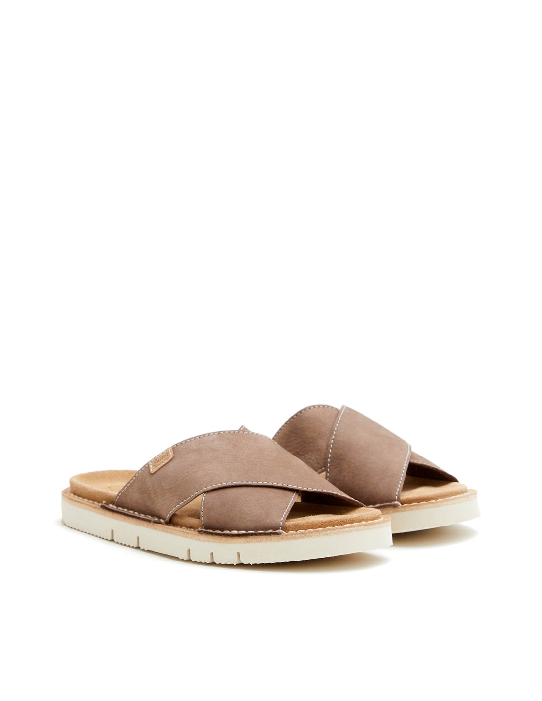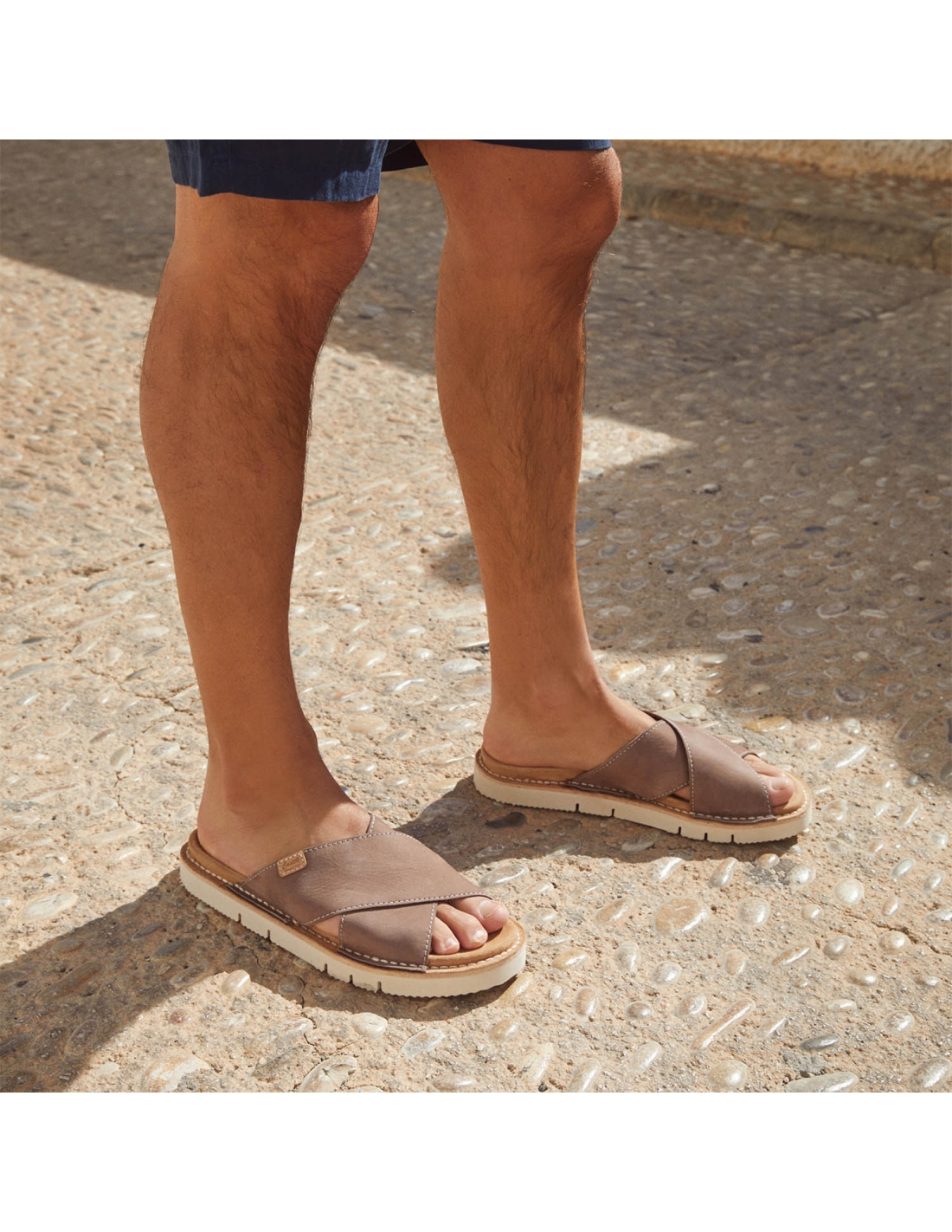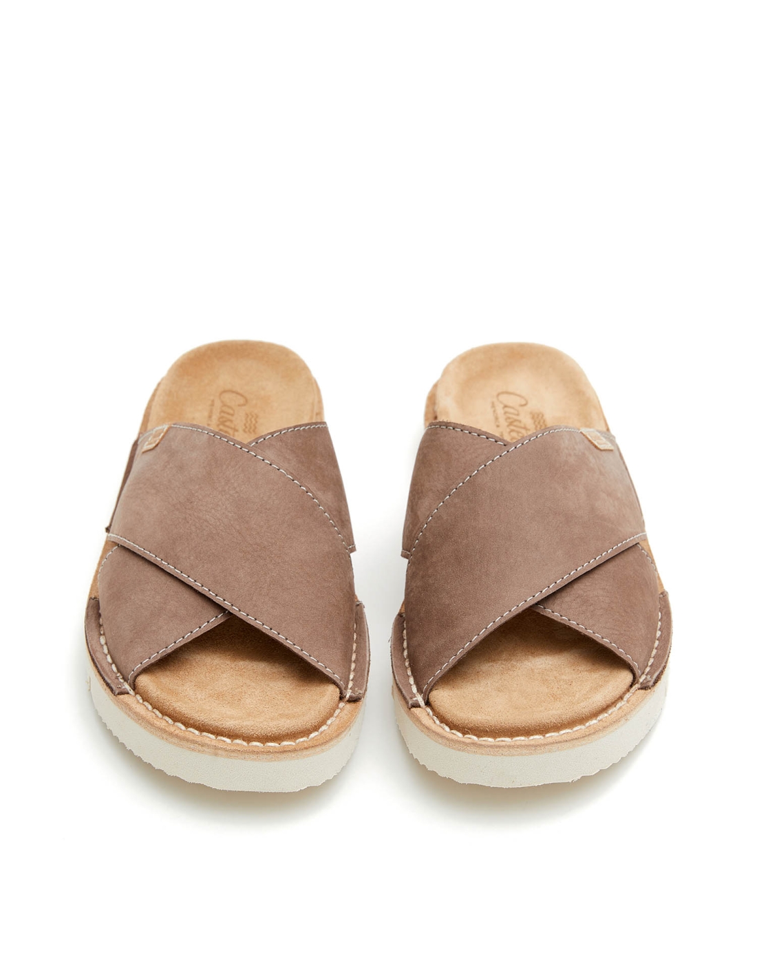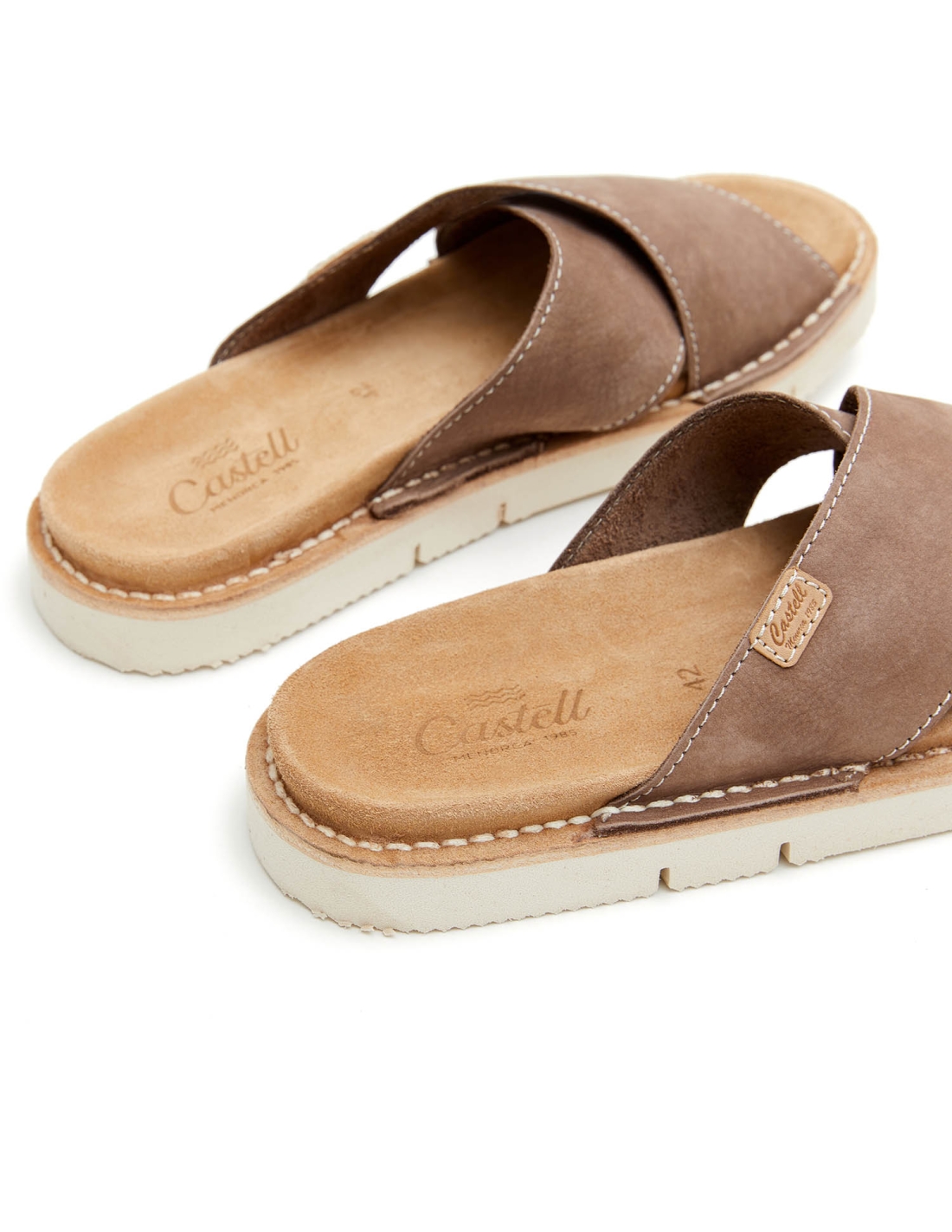Sandàlia amb pala creuada. Plantilla anatòmica i pis lleuger color ivori, cosida en forma i acabada manualment.