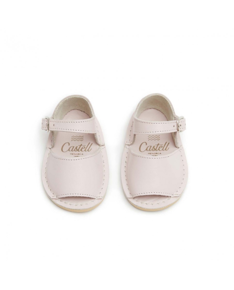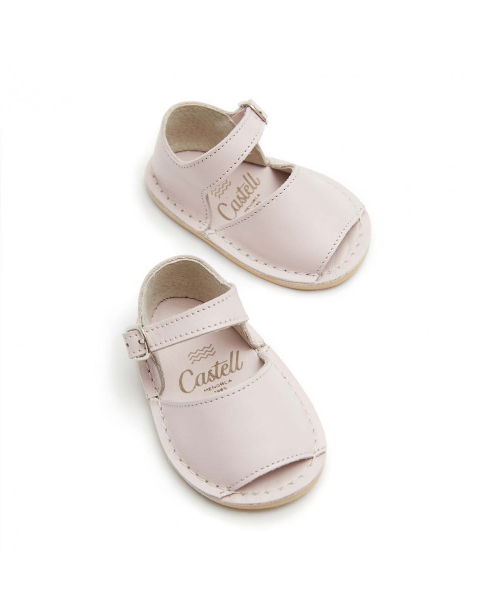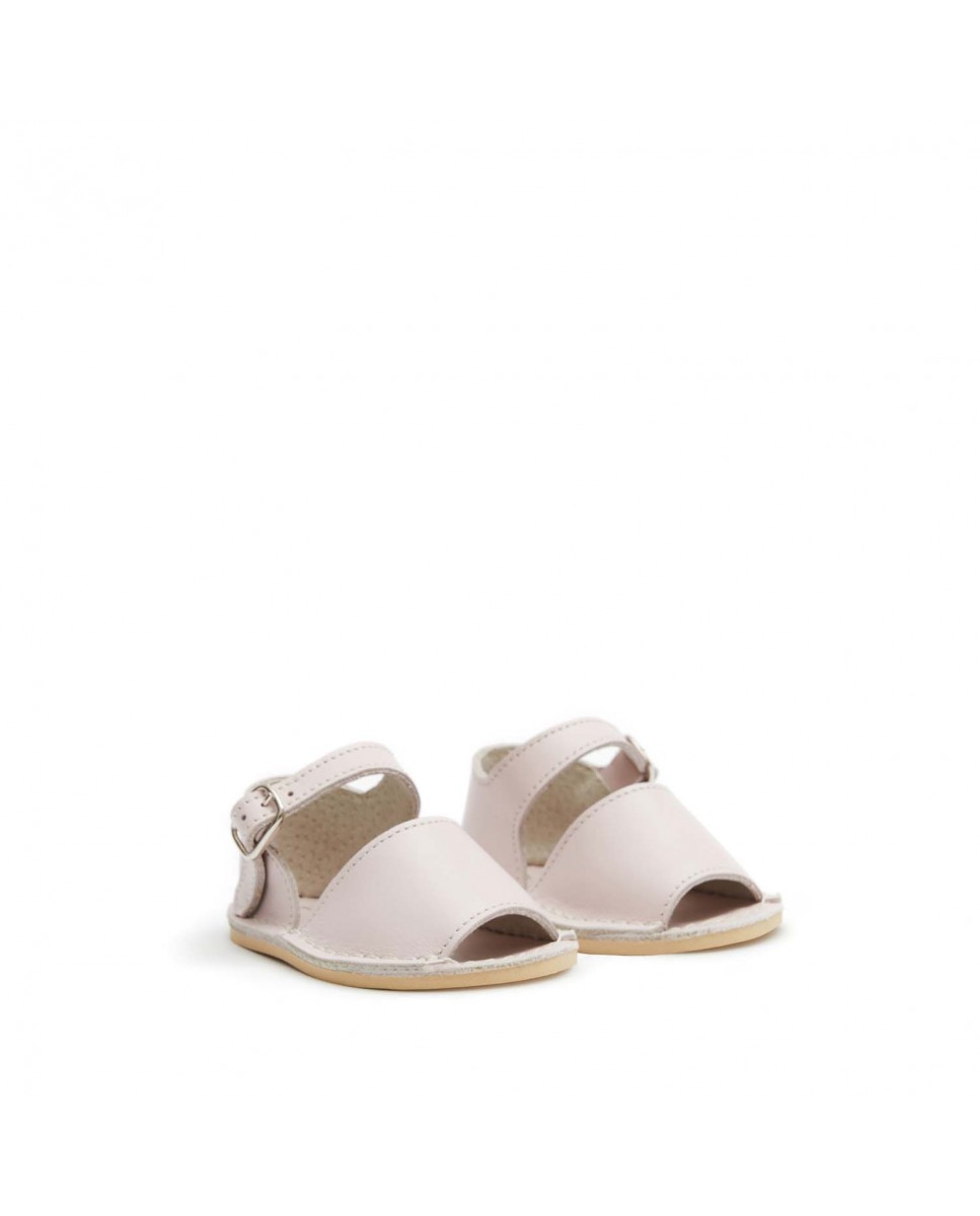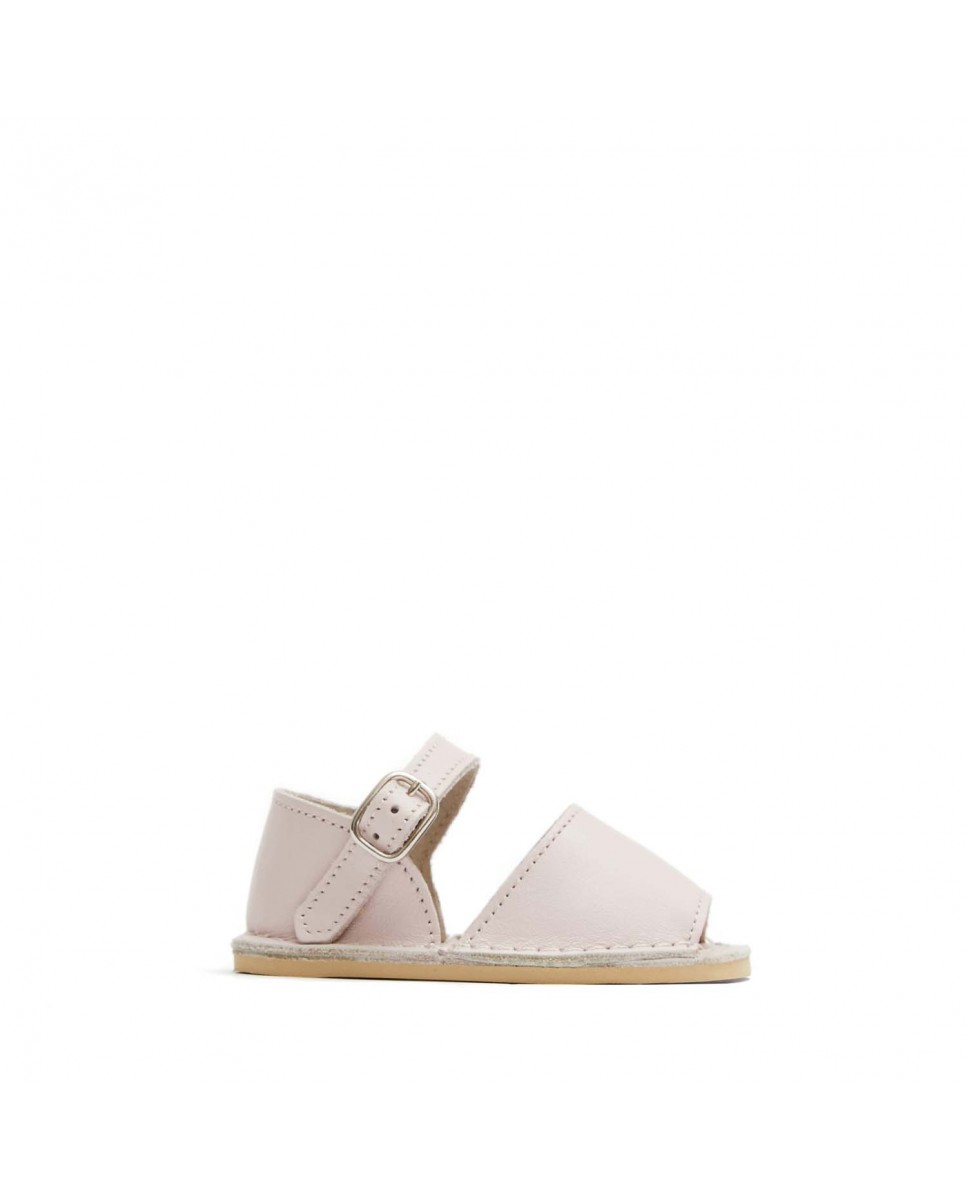 Baby Menorcan abarca. Manufactured with soft leather. Vamp and heel pad sewn to the insole. Heel strap tied to the ankle with a soft leather bracelet and a small rectangular silver buckle. Leather insole. Super flexible micro beige sole. Sole 4 mm.