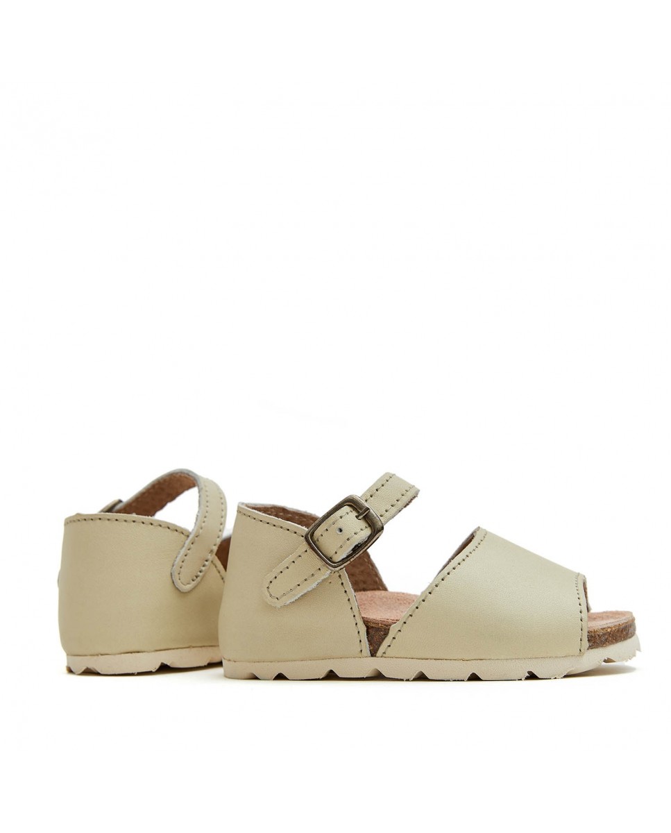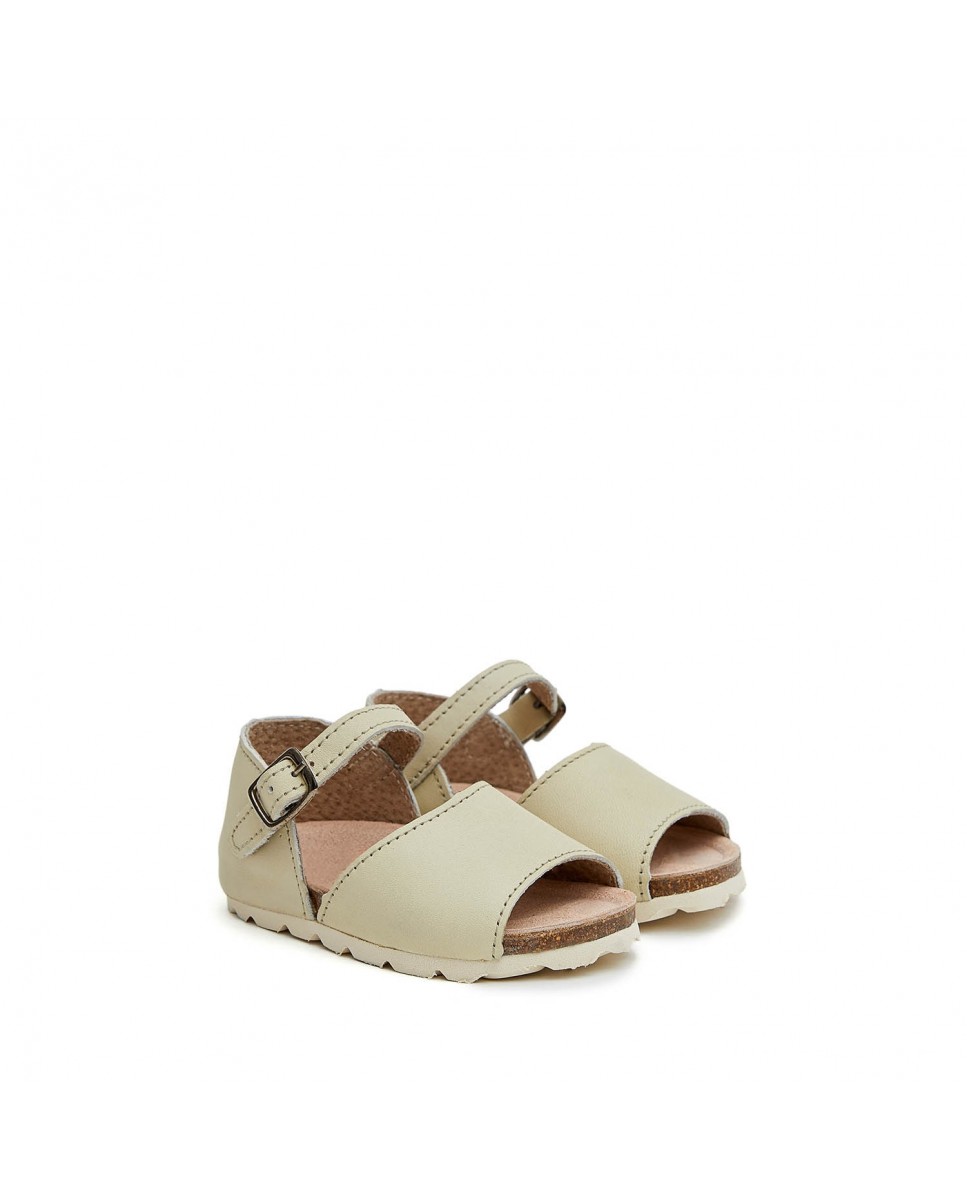 White baby's sandal with buckle fastening on the side. Anatomical insole.