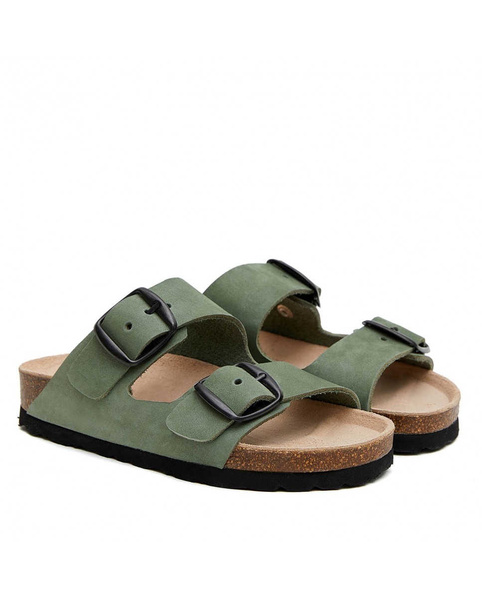 Green children's sandal with wide straps and buckles. Anatomical insole.