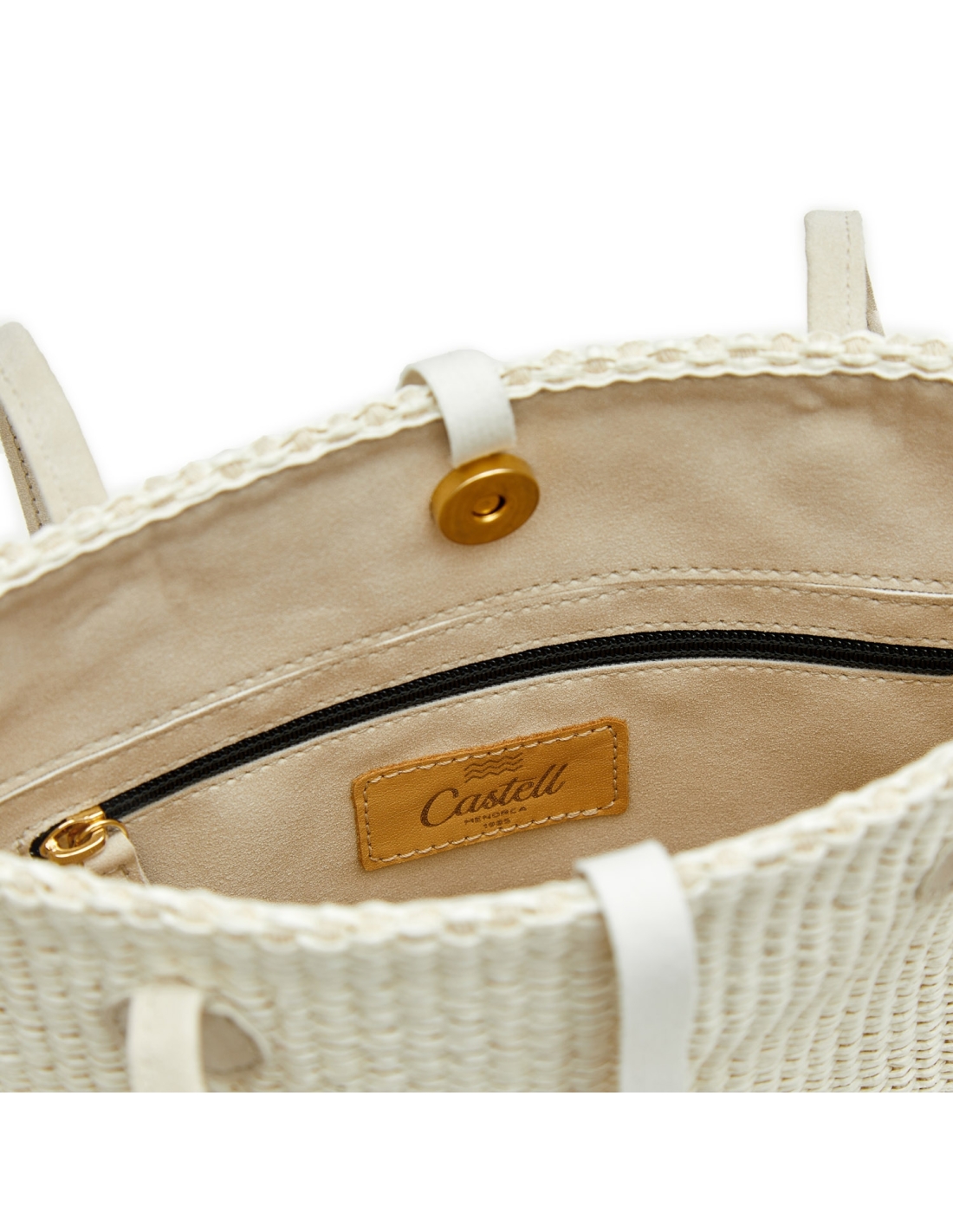 White raffia bag, handcrafted with inner pocket and magnetic closure.