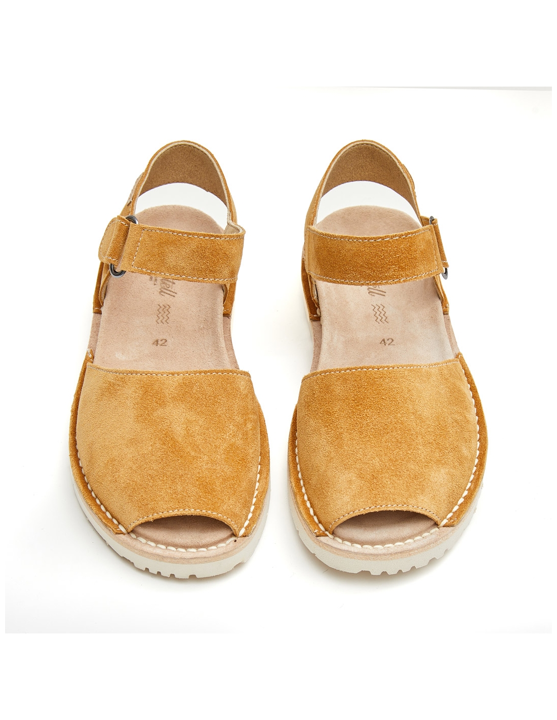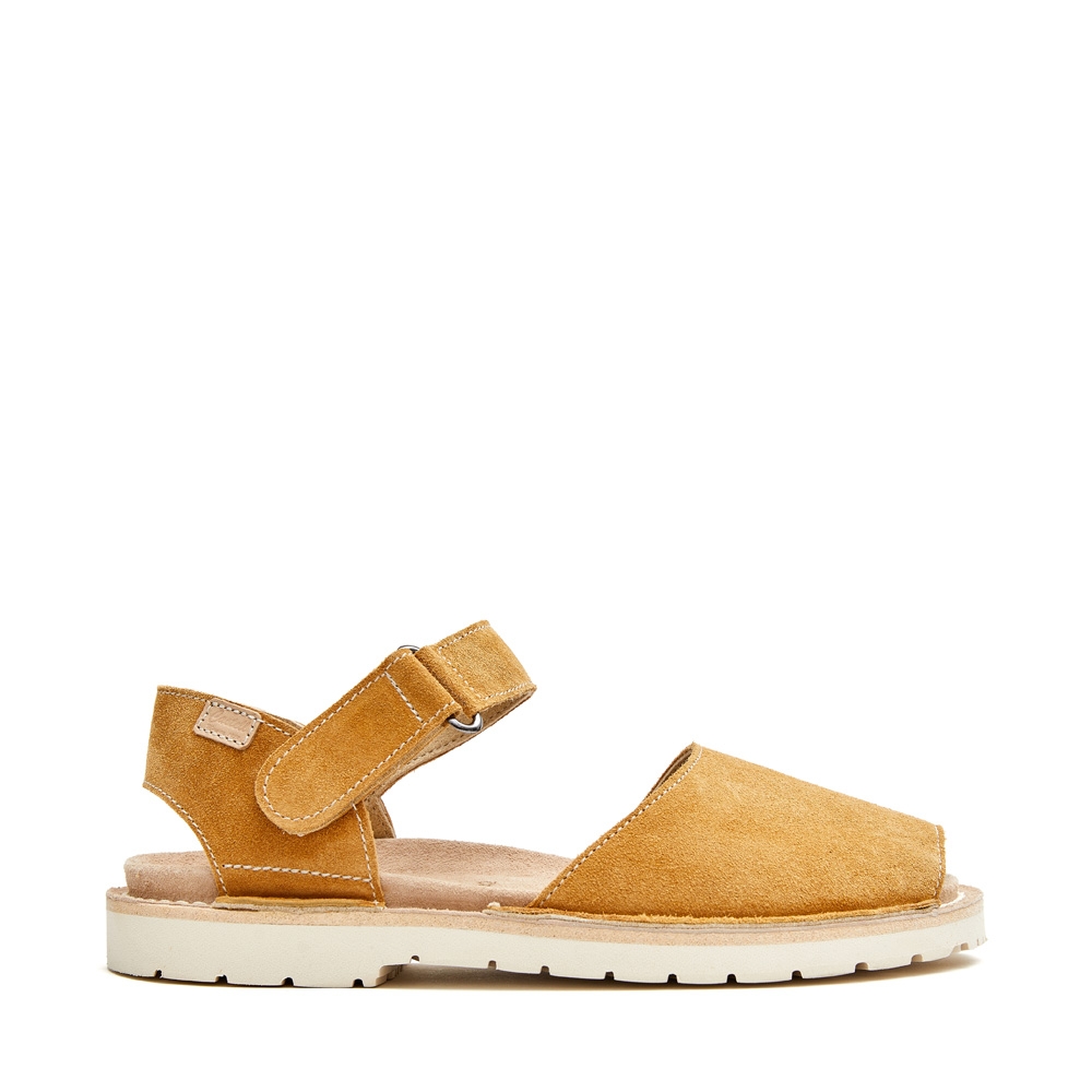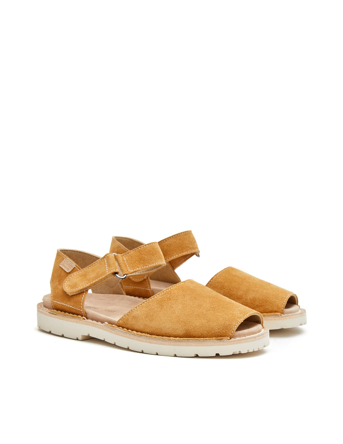 Suede Abarca frailera with anatomical insole. Uncovered heel with adjustable Velcro strap. Ivory color sole