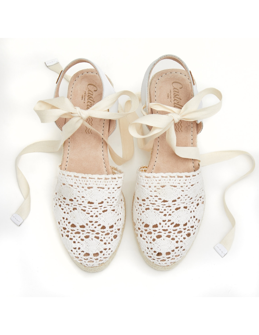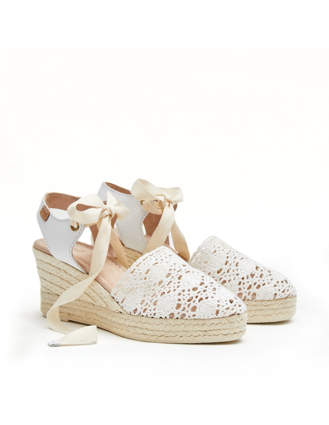 The Mari sandal blends han crafted ganxet per a la perfecta 7 cm wedge height. Available in white or black and finished with charming ankle tie, it's feminine, elegant i comfortable model — ideal per breezy summer looks.