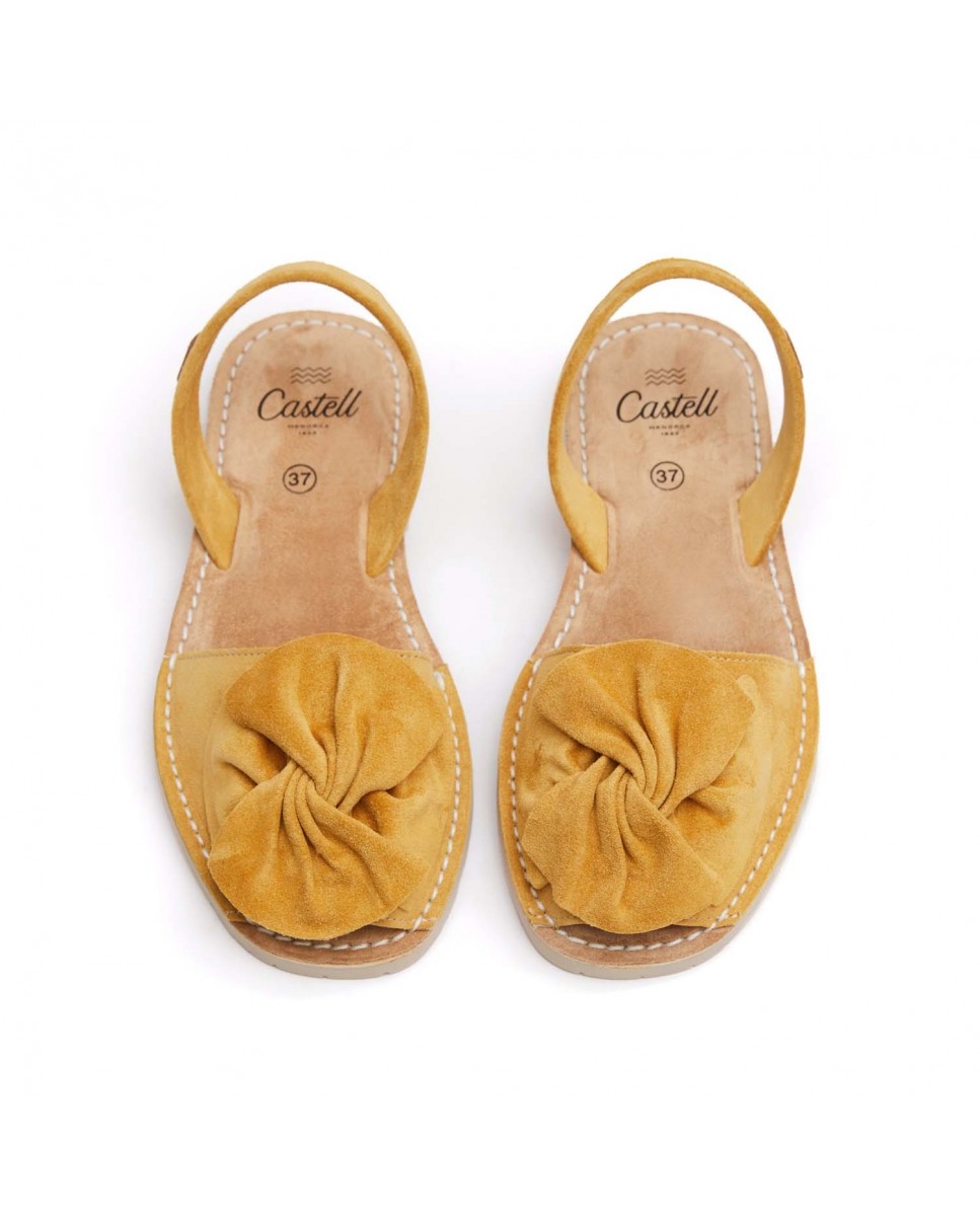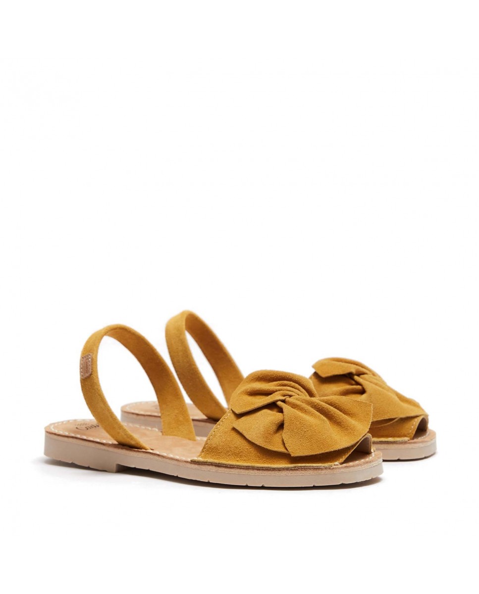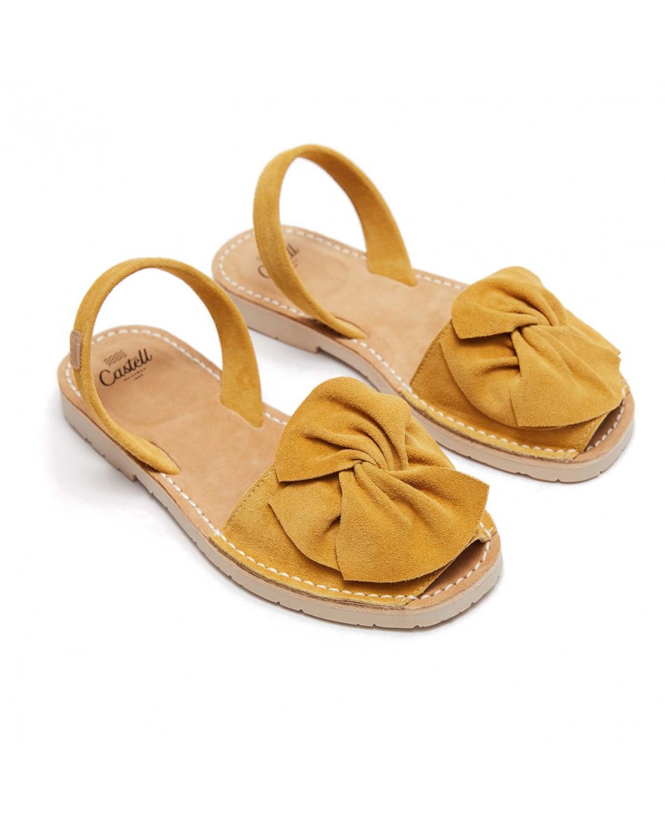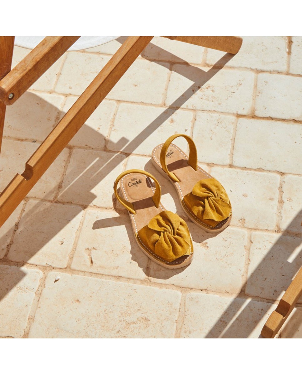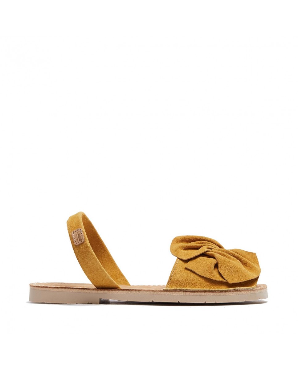 Menorcan sandals with bow ornament. Top quality Italian split leather vamp with leather lining. Padded split leather insole, ivory rubber sole with a little rise, height of 1.5cm.