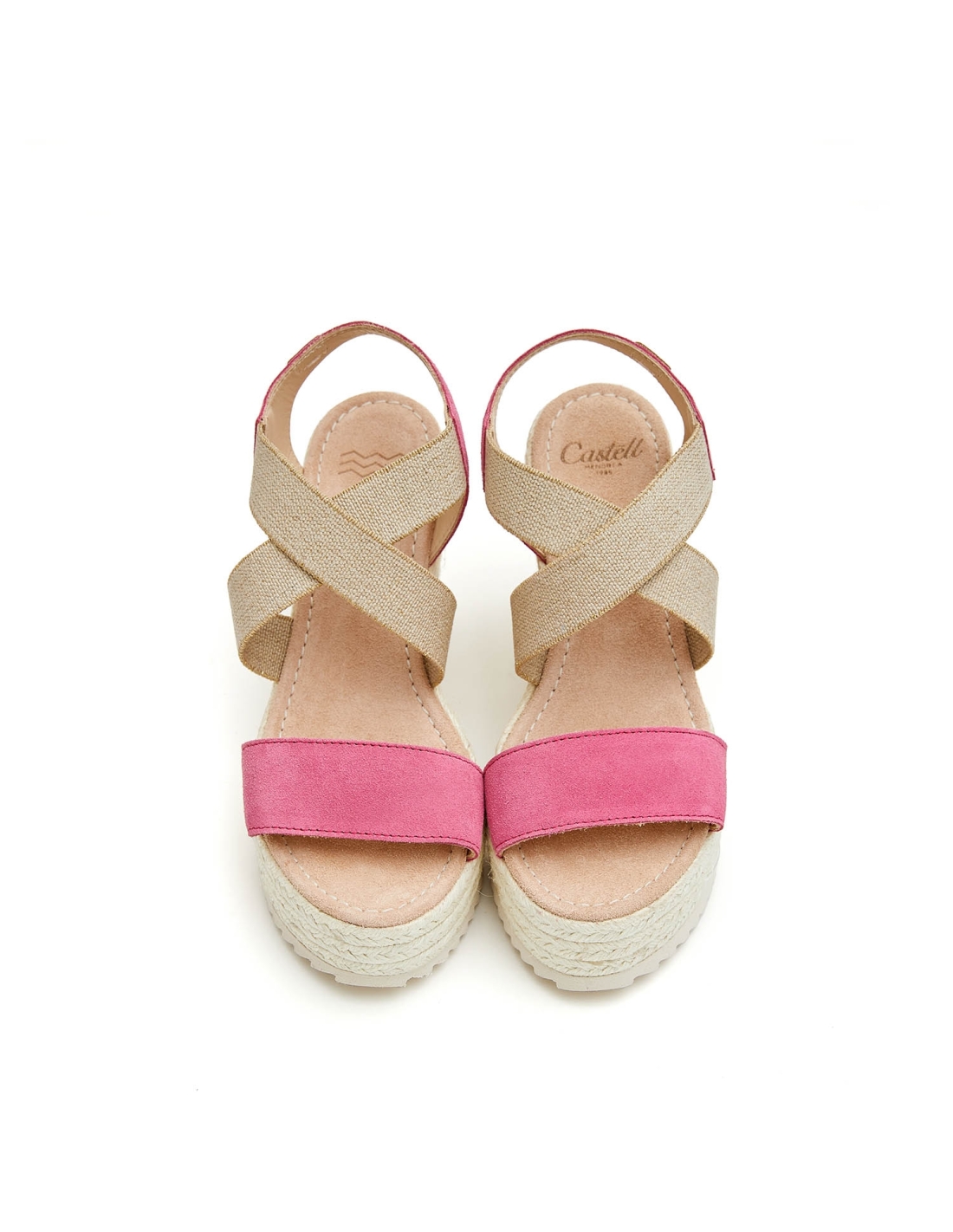 Jute sandal with crossed elastic. Model made of top quality italian split leather. lined. Adaptable model thanks to its crossed elastic. Padded insole. Total height of 9 cm, platform of 3 cm and wedge of 6 cm.