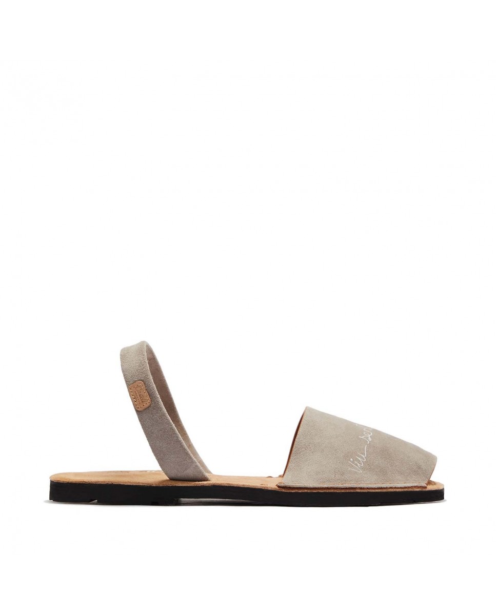 Women's eco-friendly menorcan abarca. Recycled collection. Made with 1st quality Italian split leather. Drawing on the vamp, left vamp with dragonfly drawing, right vamp with the slogan "Live, feel, breathe". Split leather strip on the edge. Padded split leather insole. Recycled tire rubber sole.