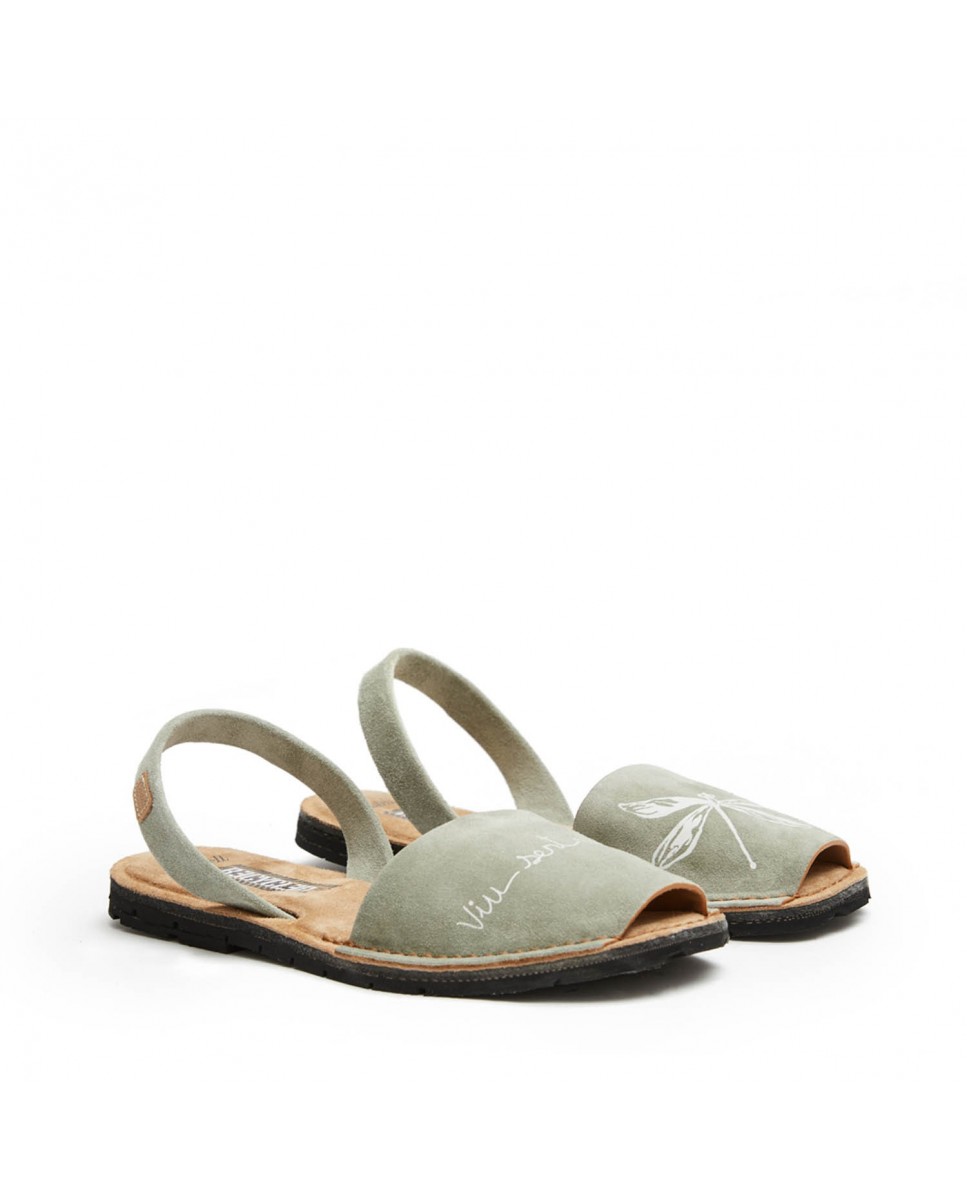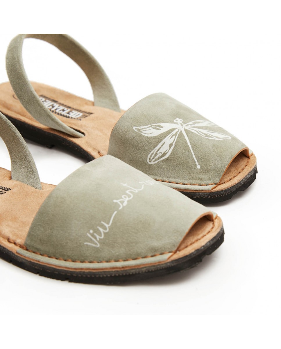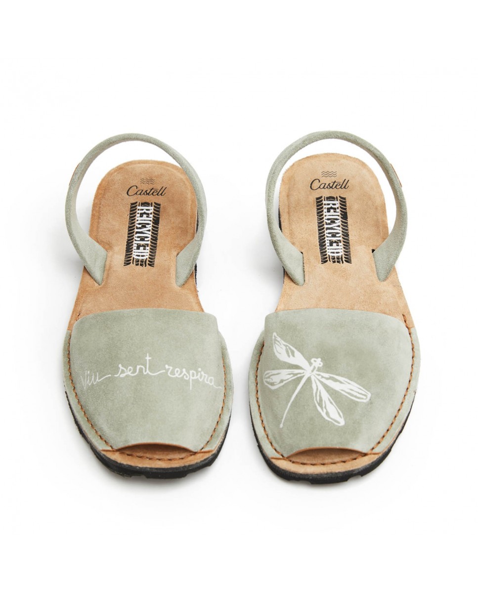 Women's eco-friendly menorcan abarca. Recycled collection. Made with 1st quality Italian split leather. Drawing on the vamp, left vamp with dragonfly drawing, right vamp with the slogan "Live, feel, breathe". Split leather strip on the edge. Padded split leather insole. Recycled tire rubber sole.