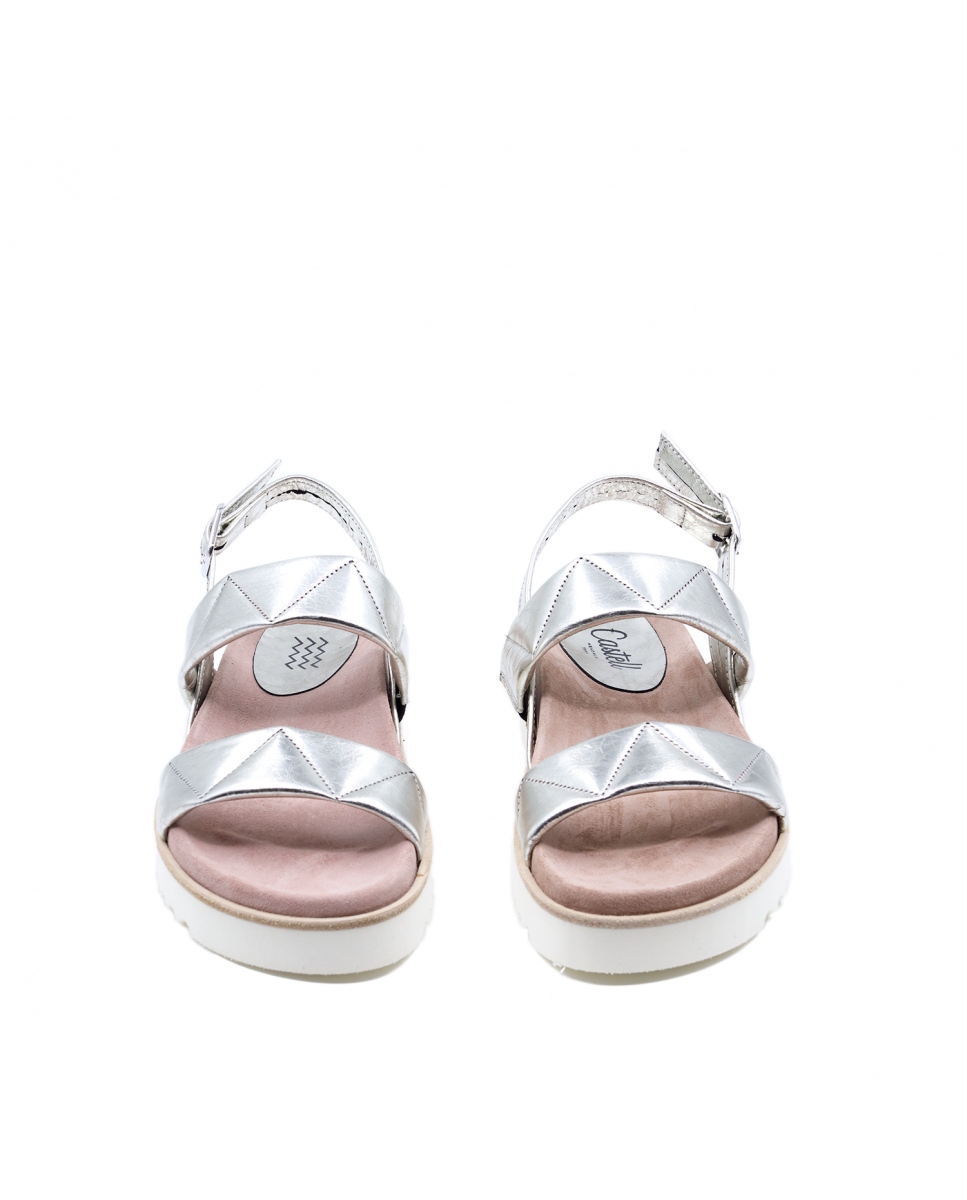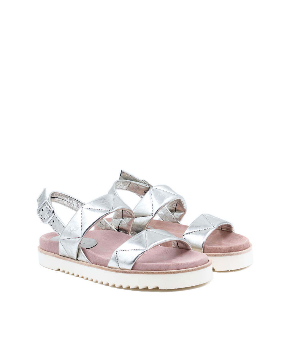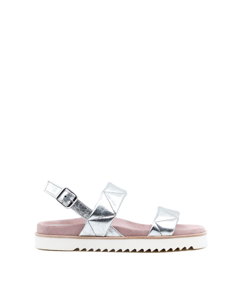 Metallic leather sandal. Two front straps and back strap in metallic leather. Back strap tied with a silver rectangular buckle. Padded anatomical insole. White rubber sole. Height 3 cm.