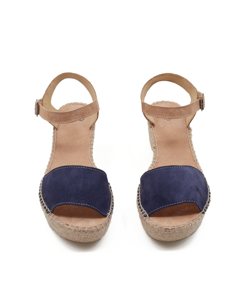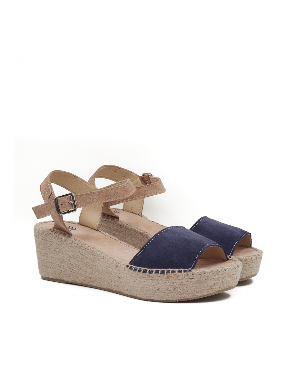 Hand-stitched suede sandal with 6,5 cm platform and padded insole, made in high quality Italian split leather. This model is fastened at the ankle with a split leather strap with a silver rectangular buckle.