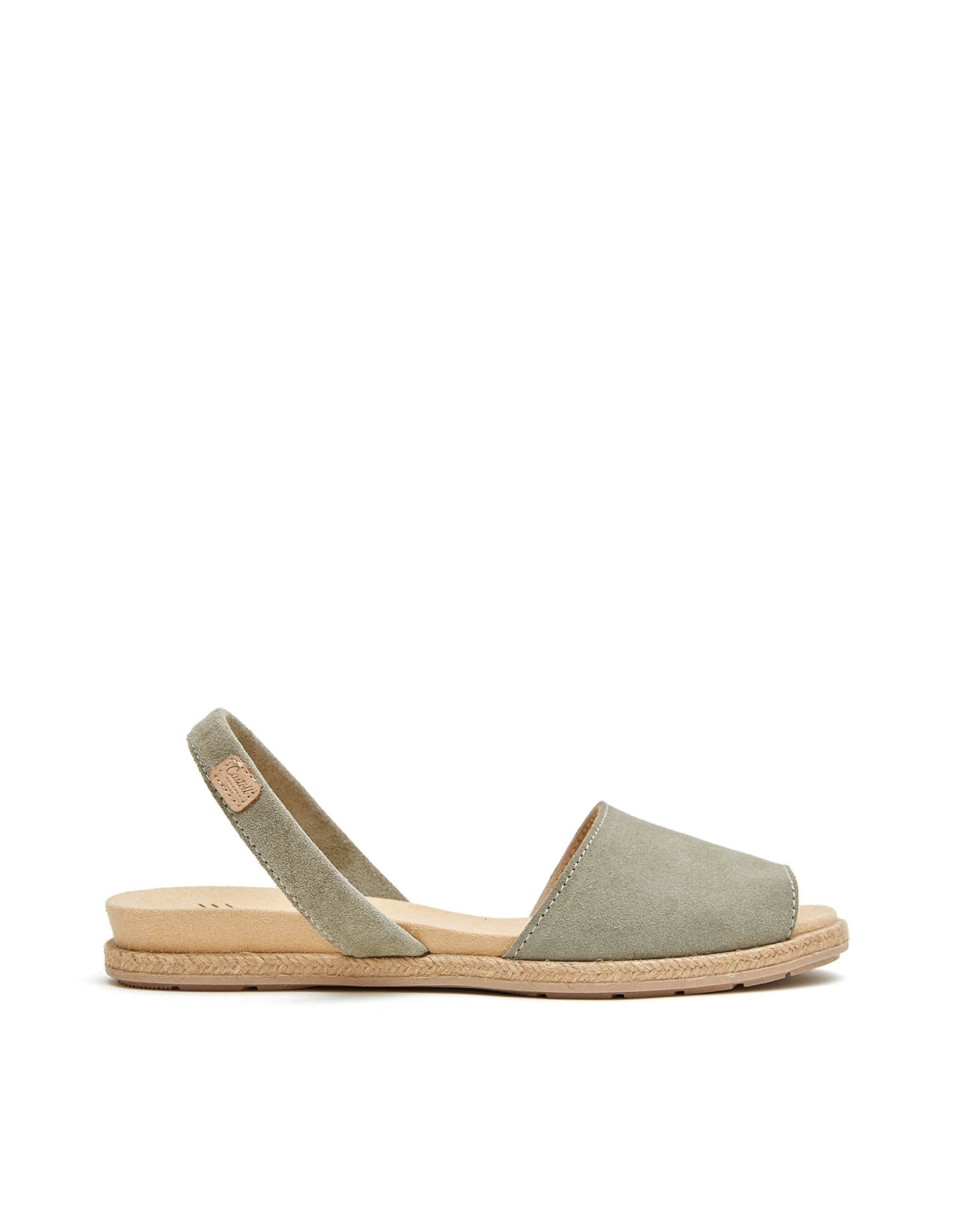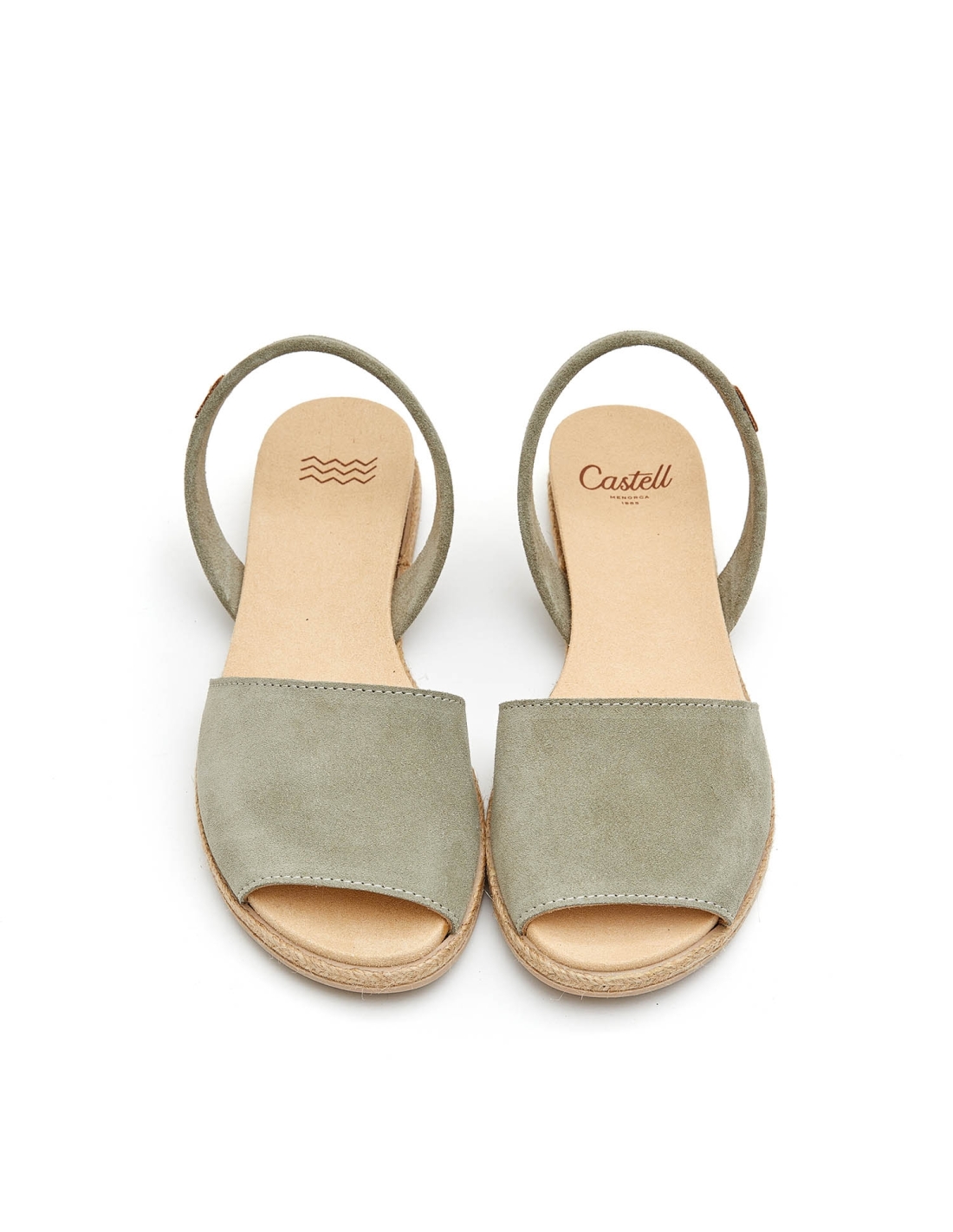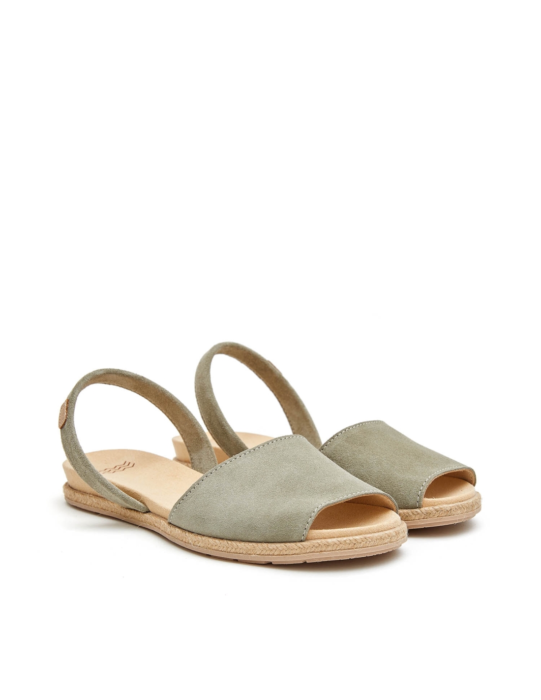 Top quality Italian split leather menorca sandal. Upper lined in leather. Upper with side buckle detail. Padded split leather insole. Jute 3 cm high.