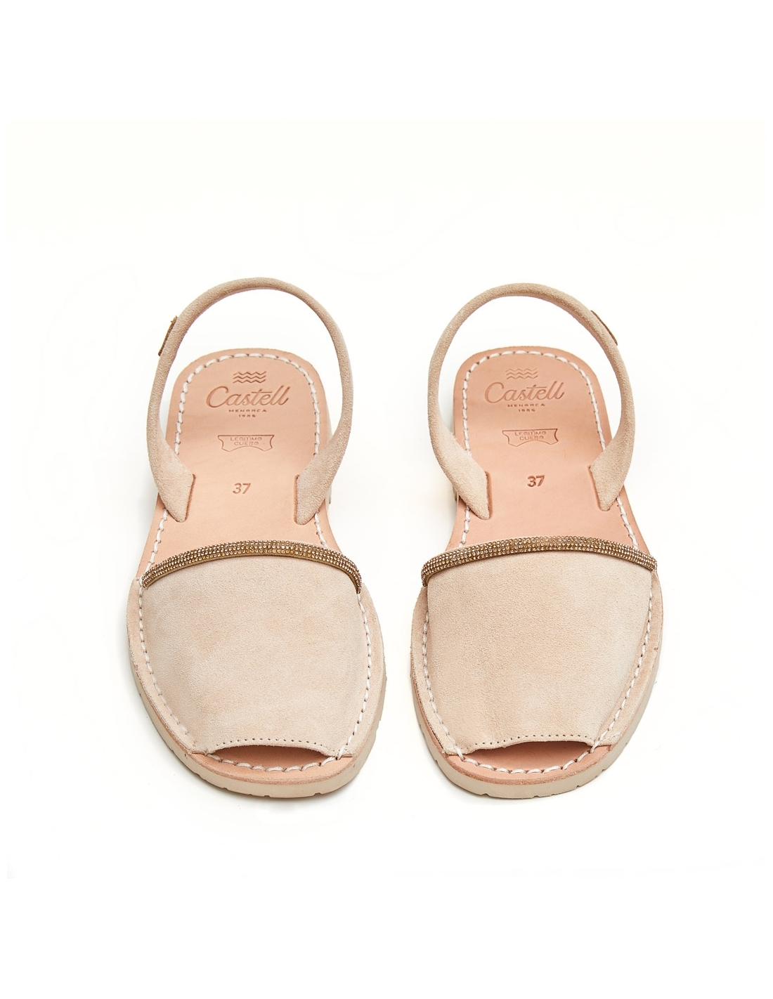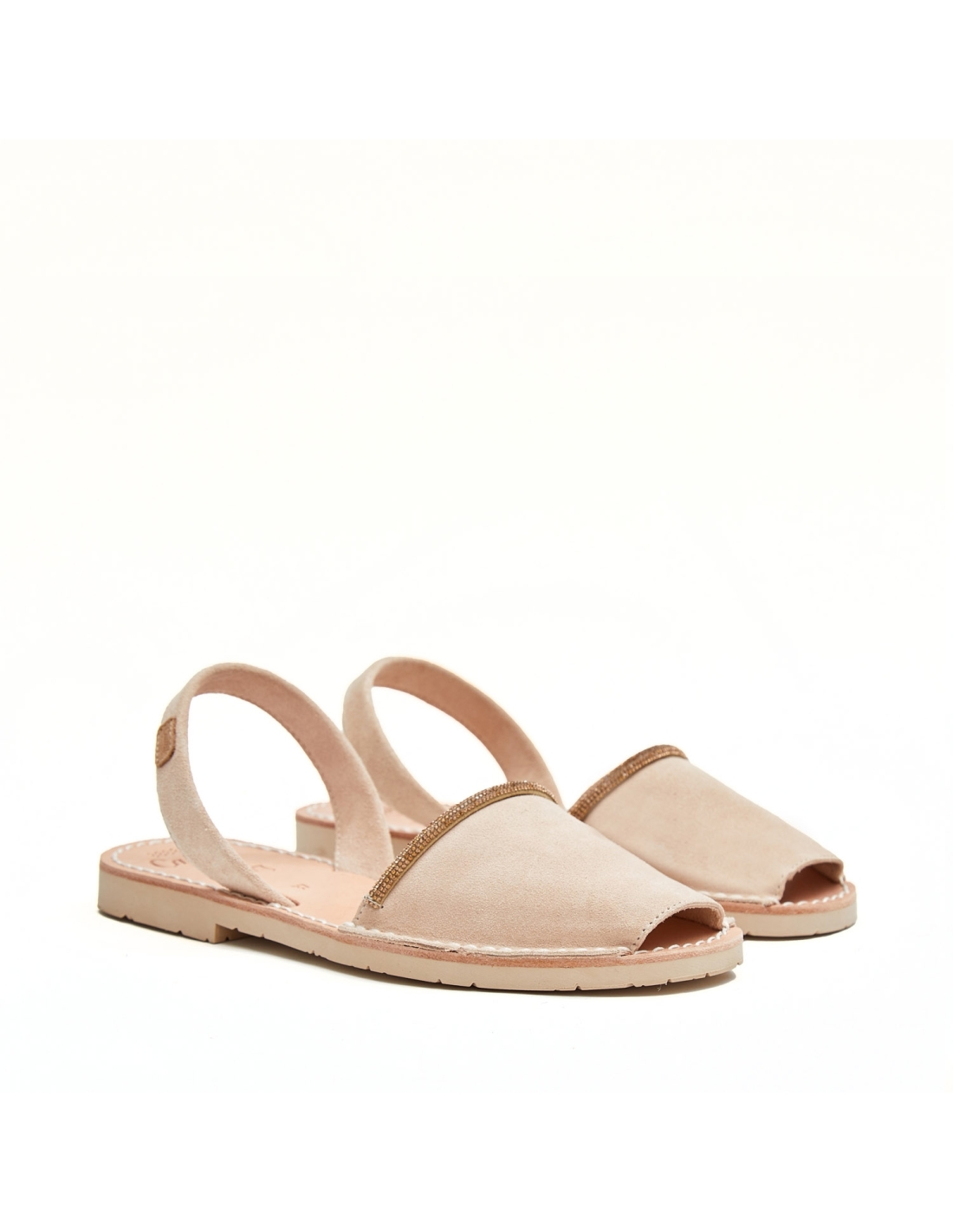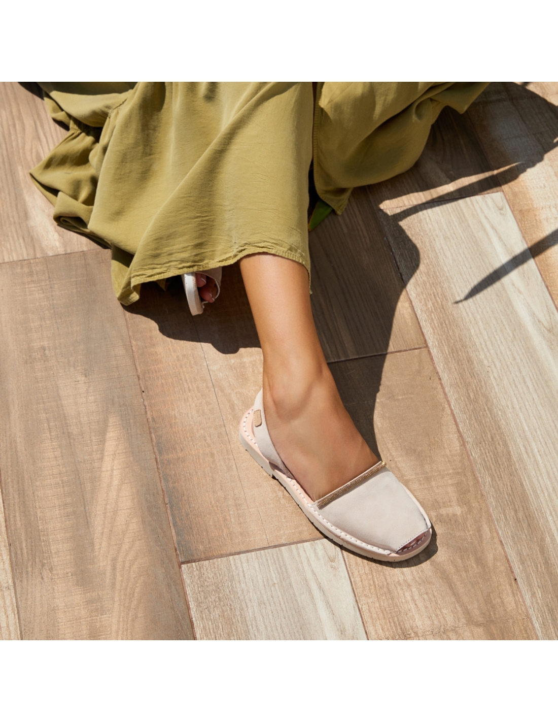 A Mediterranean classic with a subtle glow. This menorquina features premium Italian suede and a shiny lace detail that adds a refined touch of brightness. The traditional design is elevated with a modern twist, perfect for both everyday wear and evening outings. Handcrafted elegance from Menorca.
