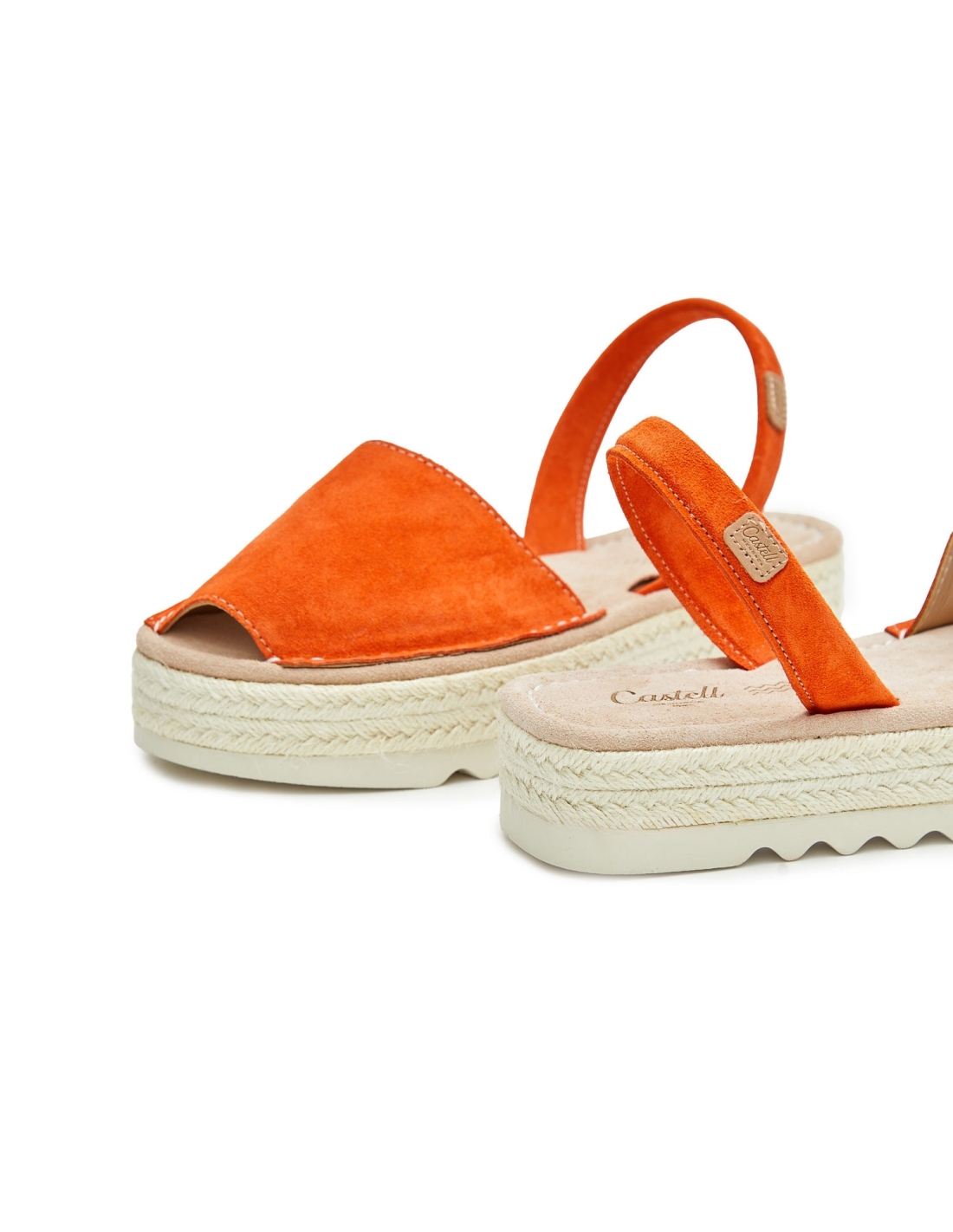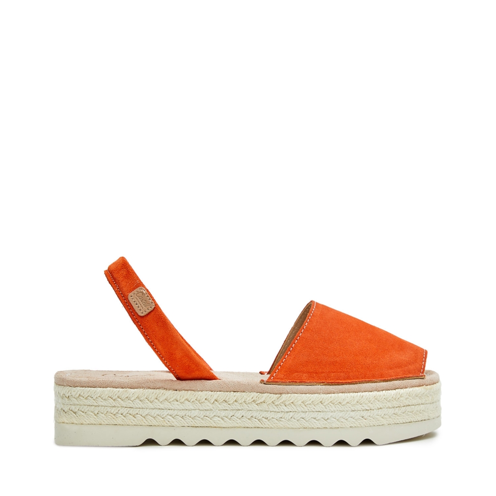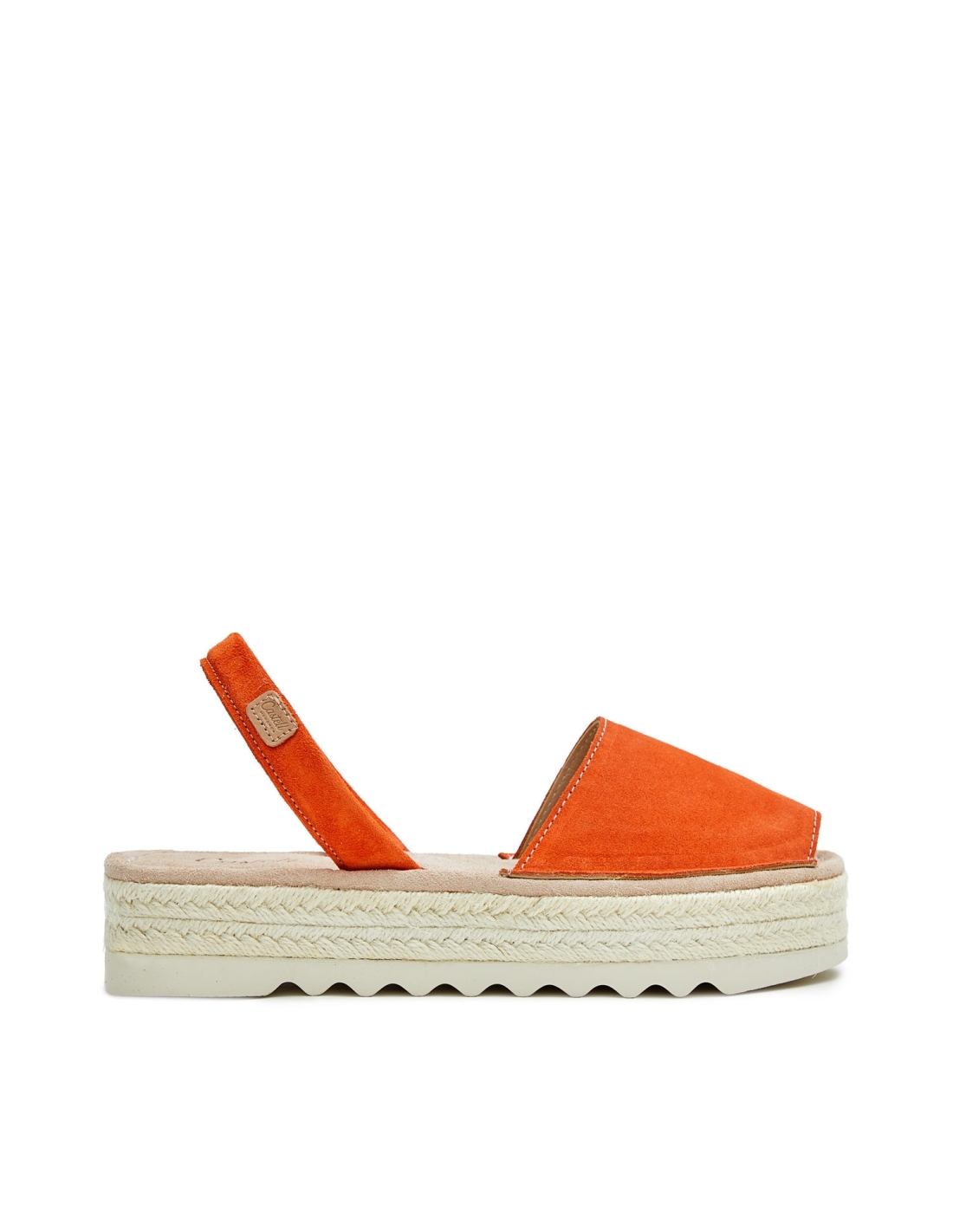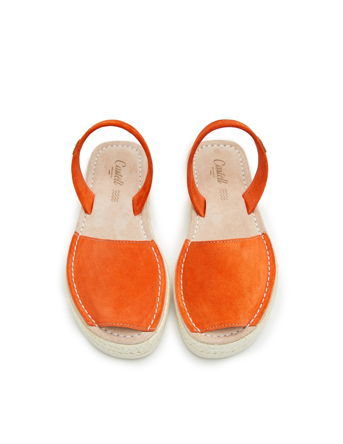 Abarca Menorquina made of top quality Italian split leather. Upper lined in leather and stitched in the same colour as the upper. of the upper. Upper stitched to the insole. Padded insole. Jute 3 cm high finished in ivory rubber.