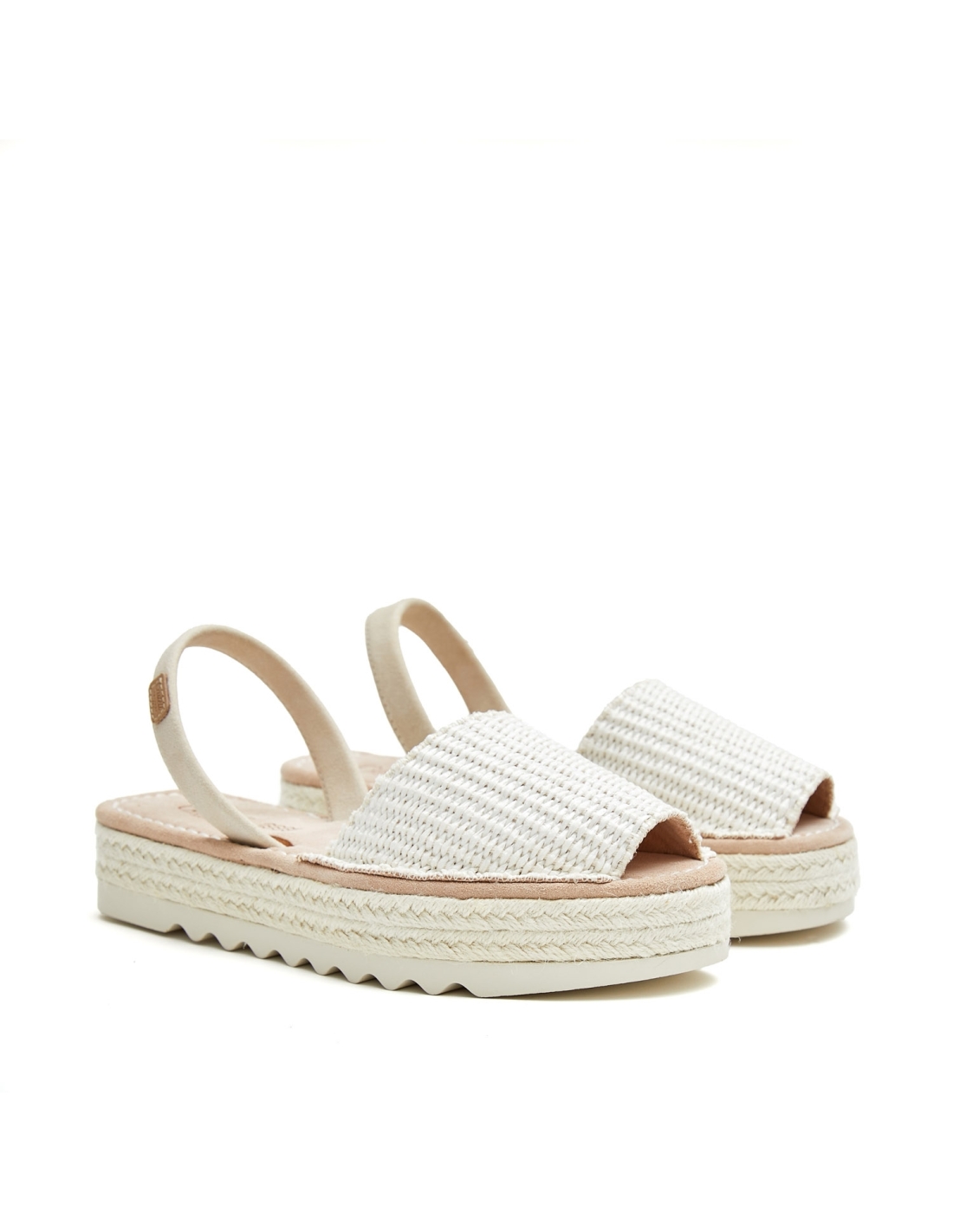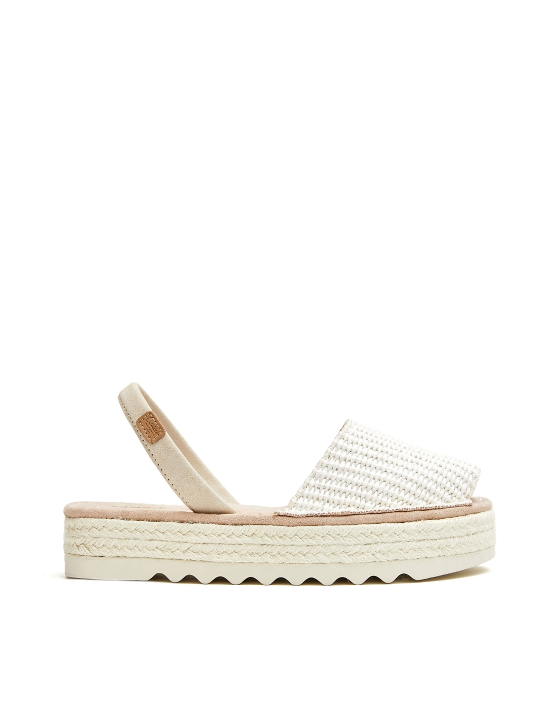 Abarca Menorquina made of raffia. Lined and stitched upper. Padded insole. Double jute platform 3 cm high finished in ivory rubber.