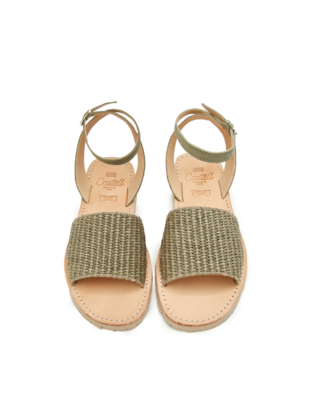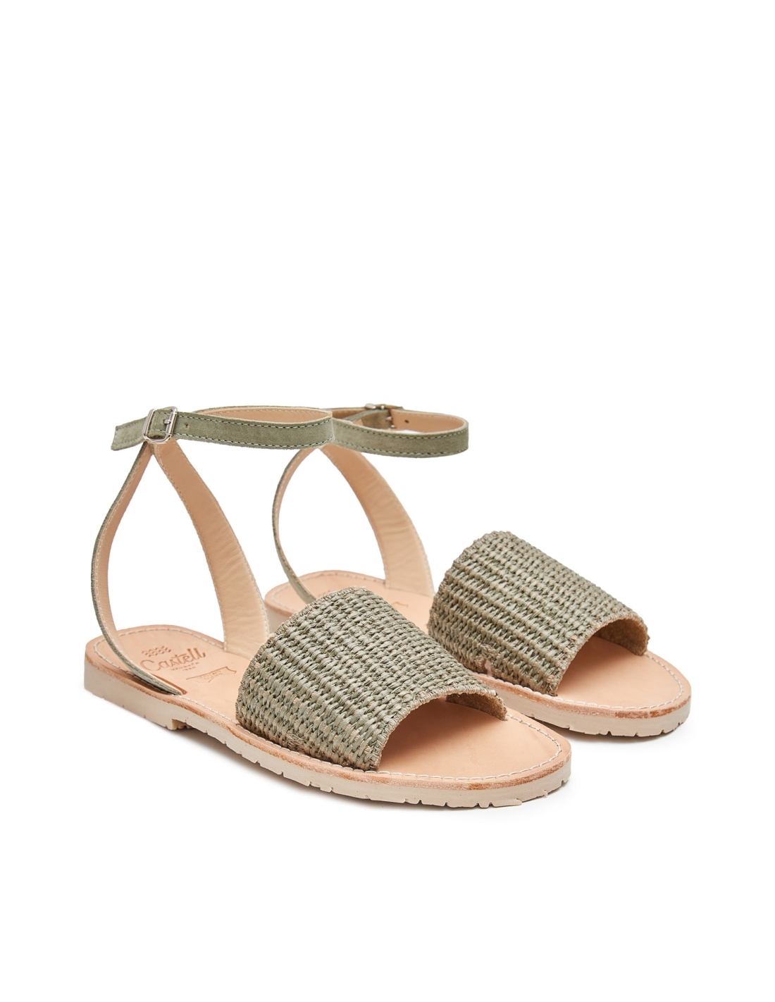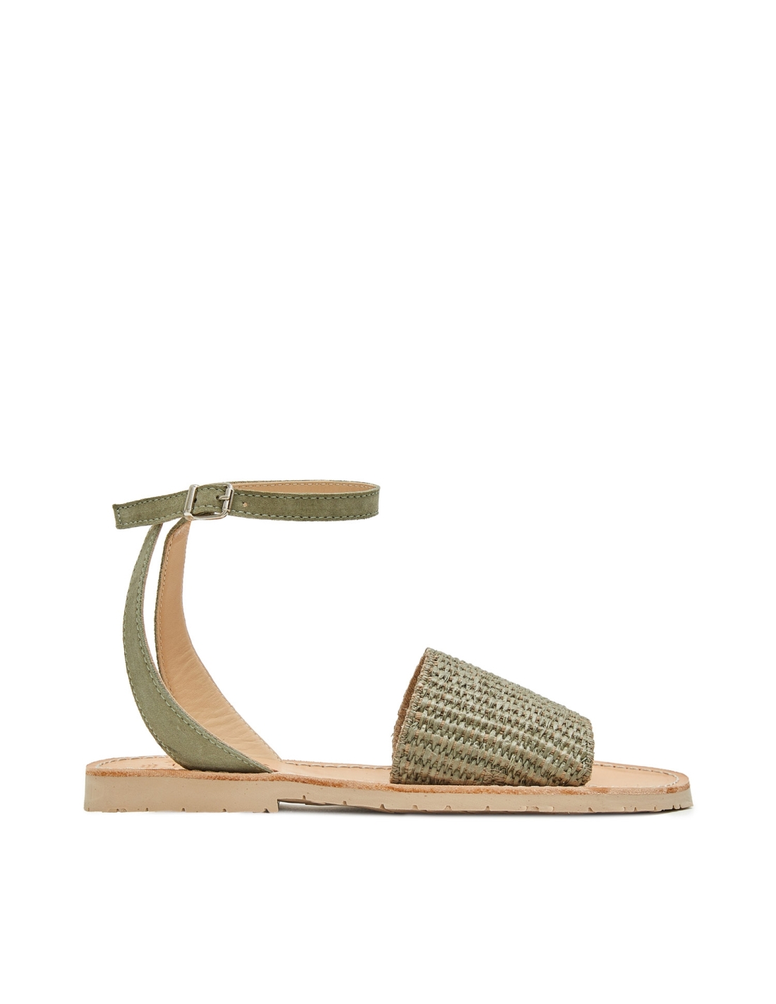 Flat raffia sandal with leather strap tied to the ankle. Rectangular golden buckle. Top quality Italian raffia upper. Lined upper.