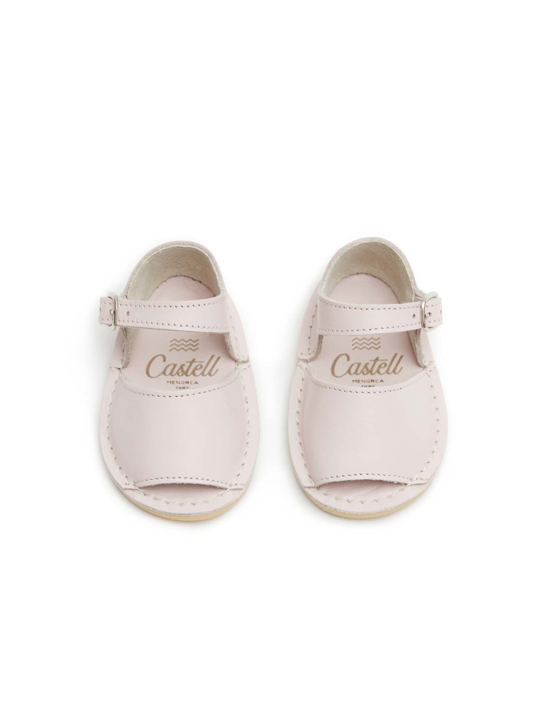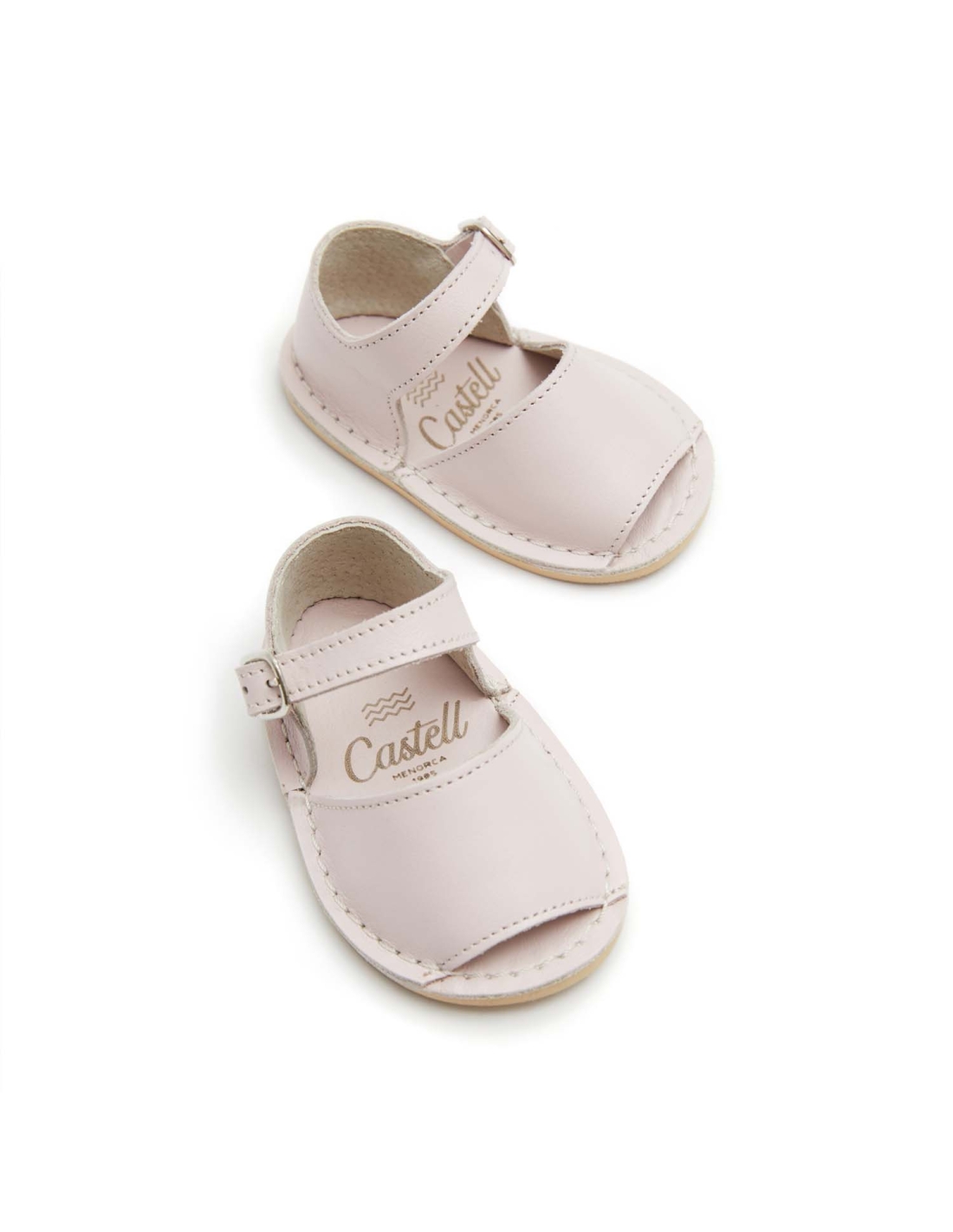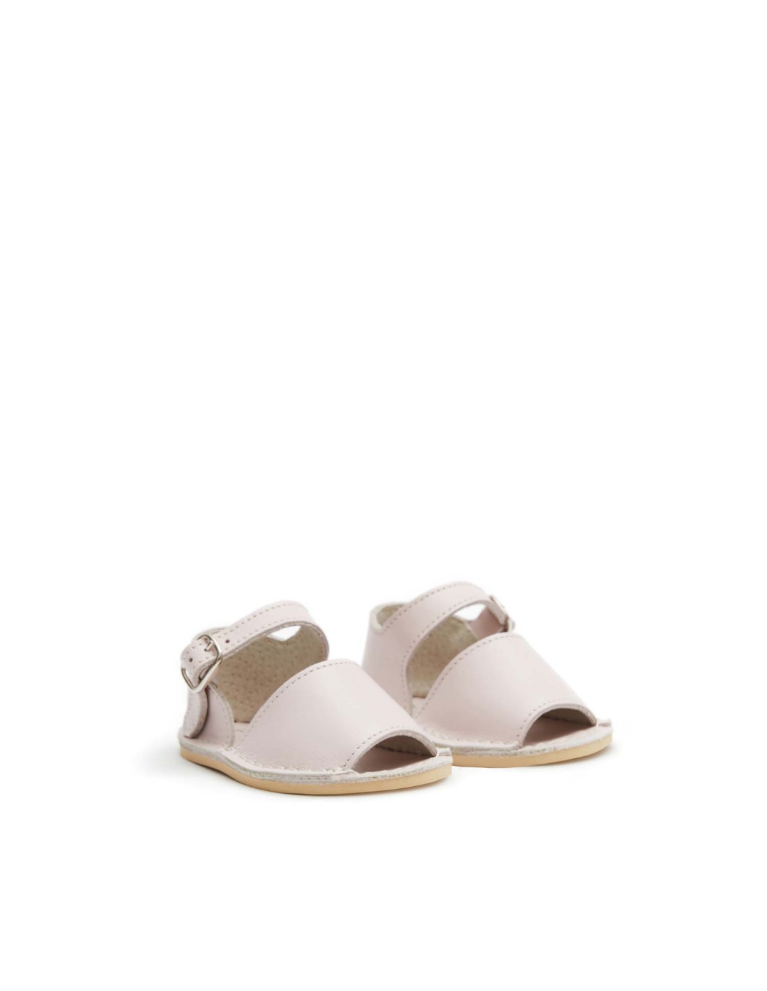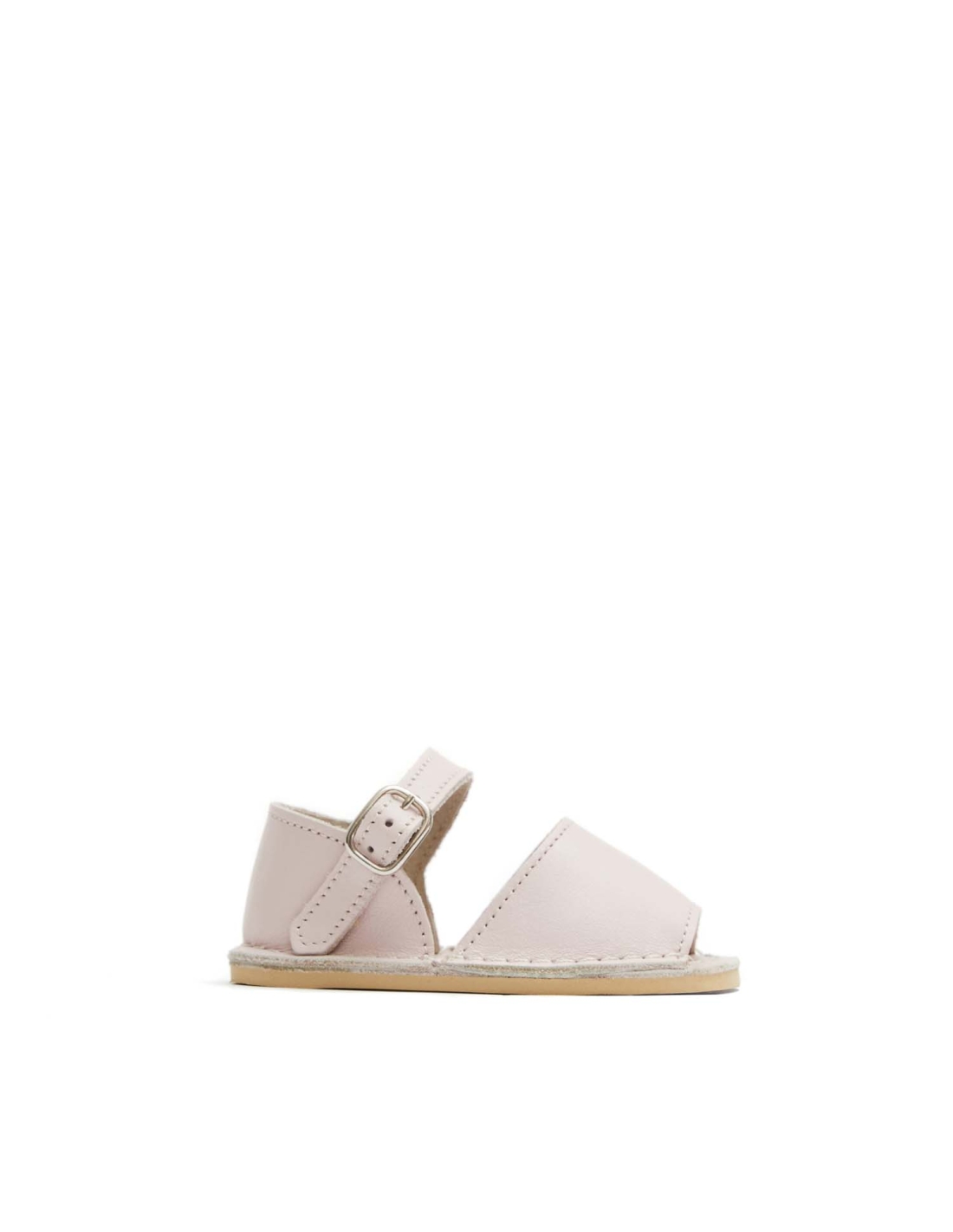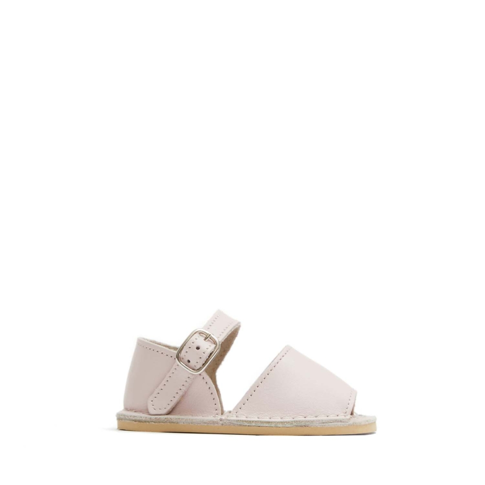 Abarca Menorquina de bebé. Fabricación elaborada con piel suave. Pala y talonera cosidas a la plantilla. Talonera atada al tobillo con una pulsera de piel suave y pequeña hebilla rectangular plateada. Plantilla de piel. Piso micro beige súper flexible. Piso 4 mm