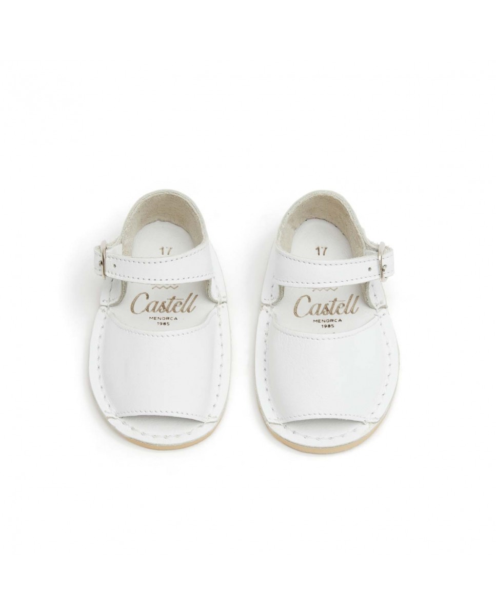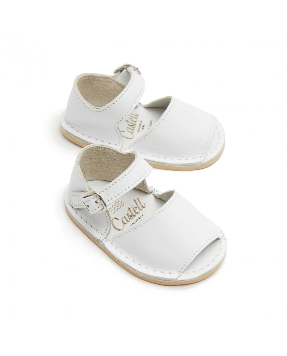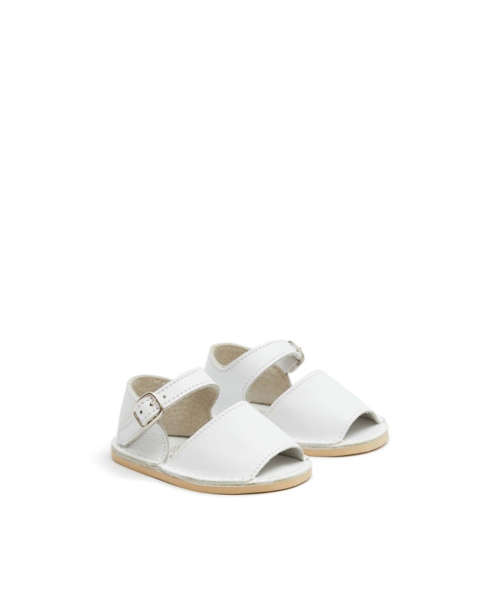Abarca Menorquina de bebé. Fabricación elaborada con piel suave. Pala y talonera cosidas a la plantilla. Talonera atada al tobillo con una pulsera de piel suave y pequeña hebilla rectangular plateada. Plantilla de piel. Piso micro beige súper flexible. Piso 4 mm