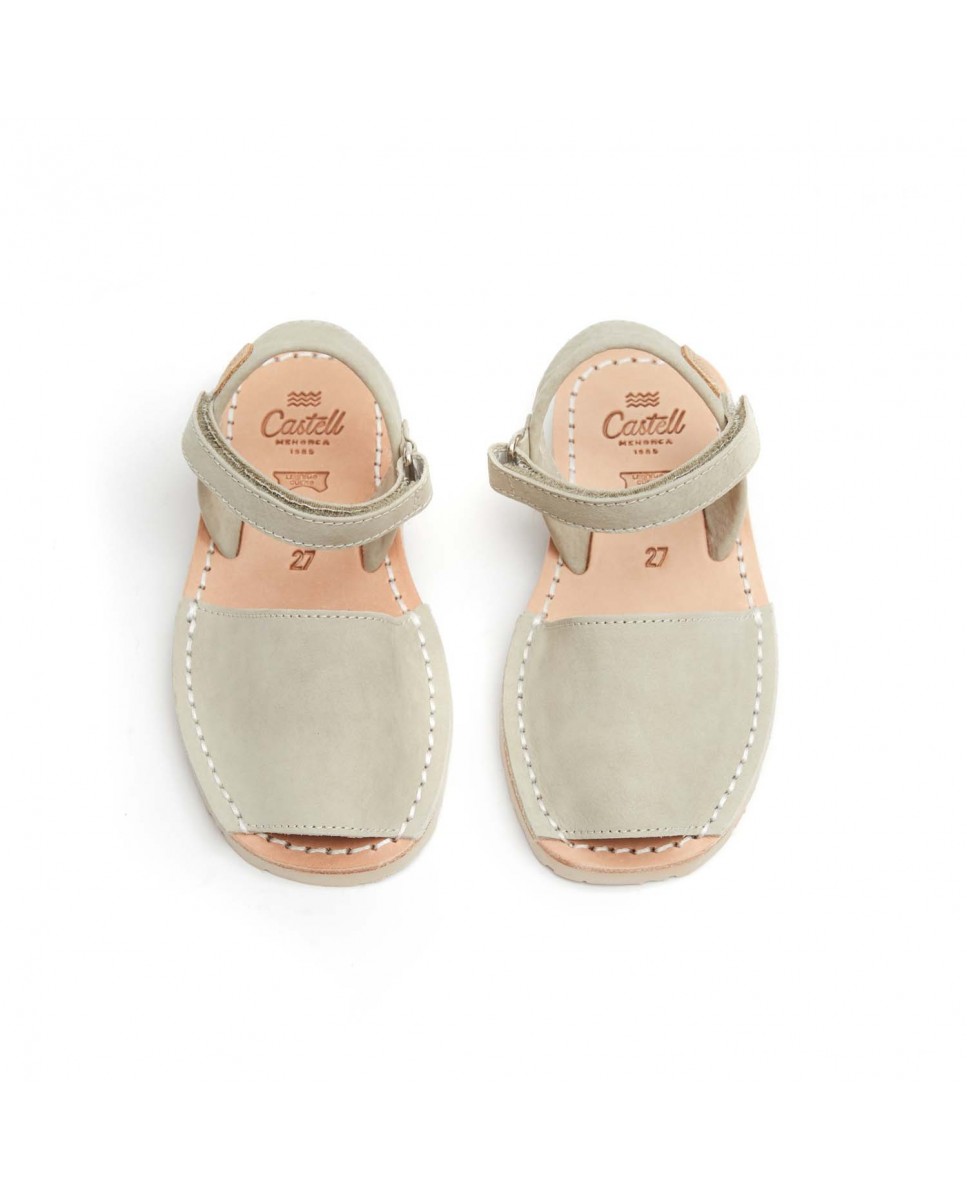 Abarca infantil hecha con goma de marfil y piel de vacuno. Pala de piel color Beige forrada. Tira de piel beige trasera cogida en el tobillo con un velcro. Pala cosida a la plantilla. Plantilla de piel. Suela de goma color marfil con alza en el talón.
