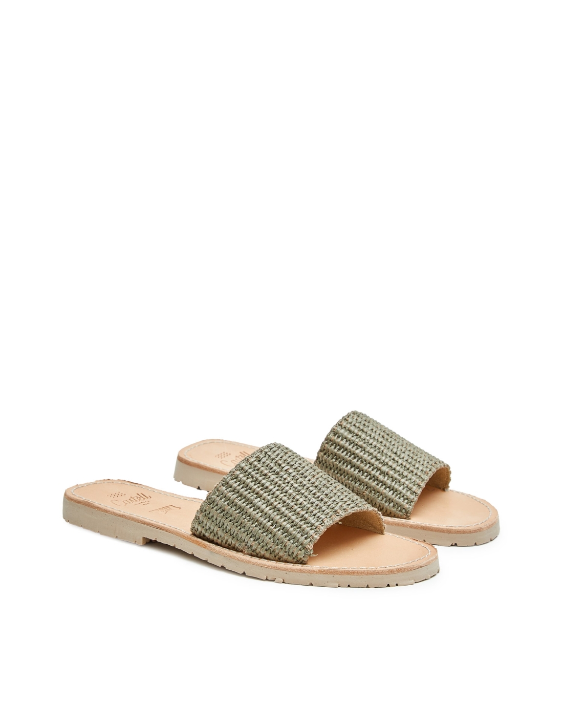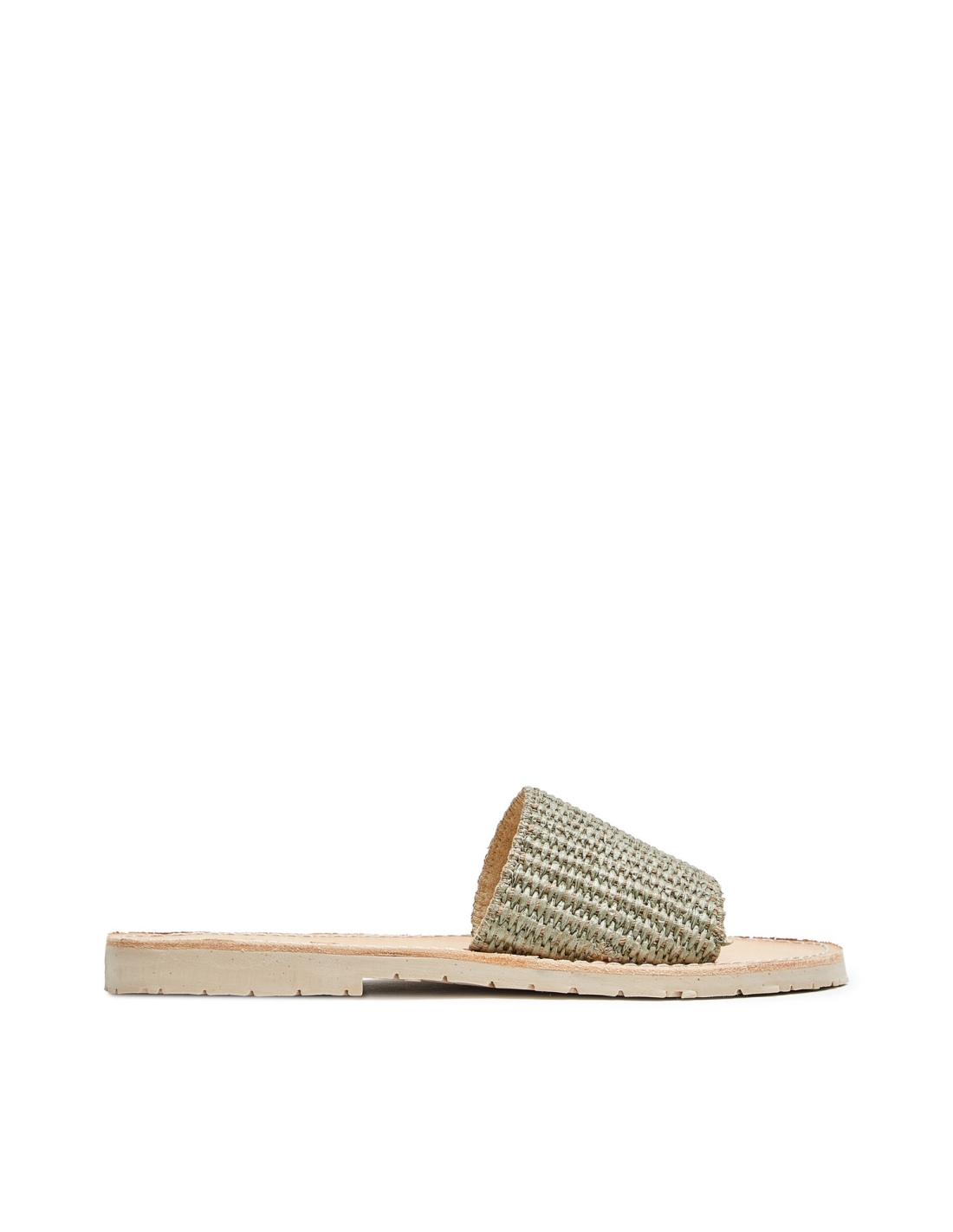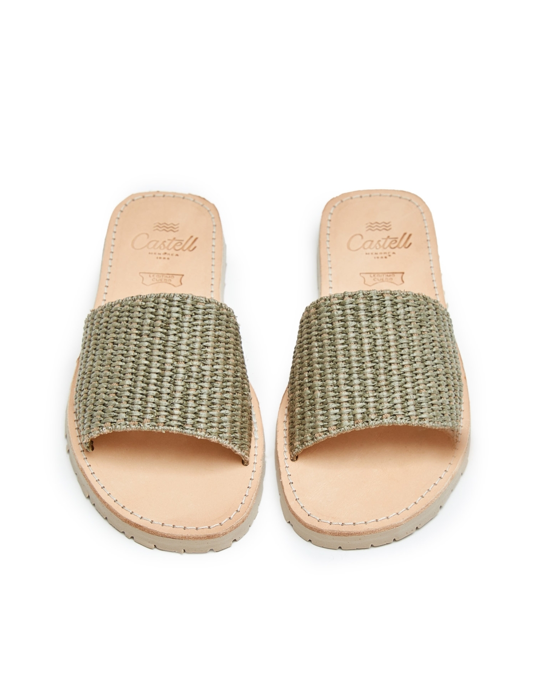 Sandalia elegante con pala forrada en rafia y estilo artesanal.