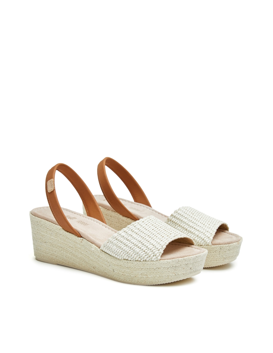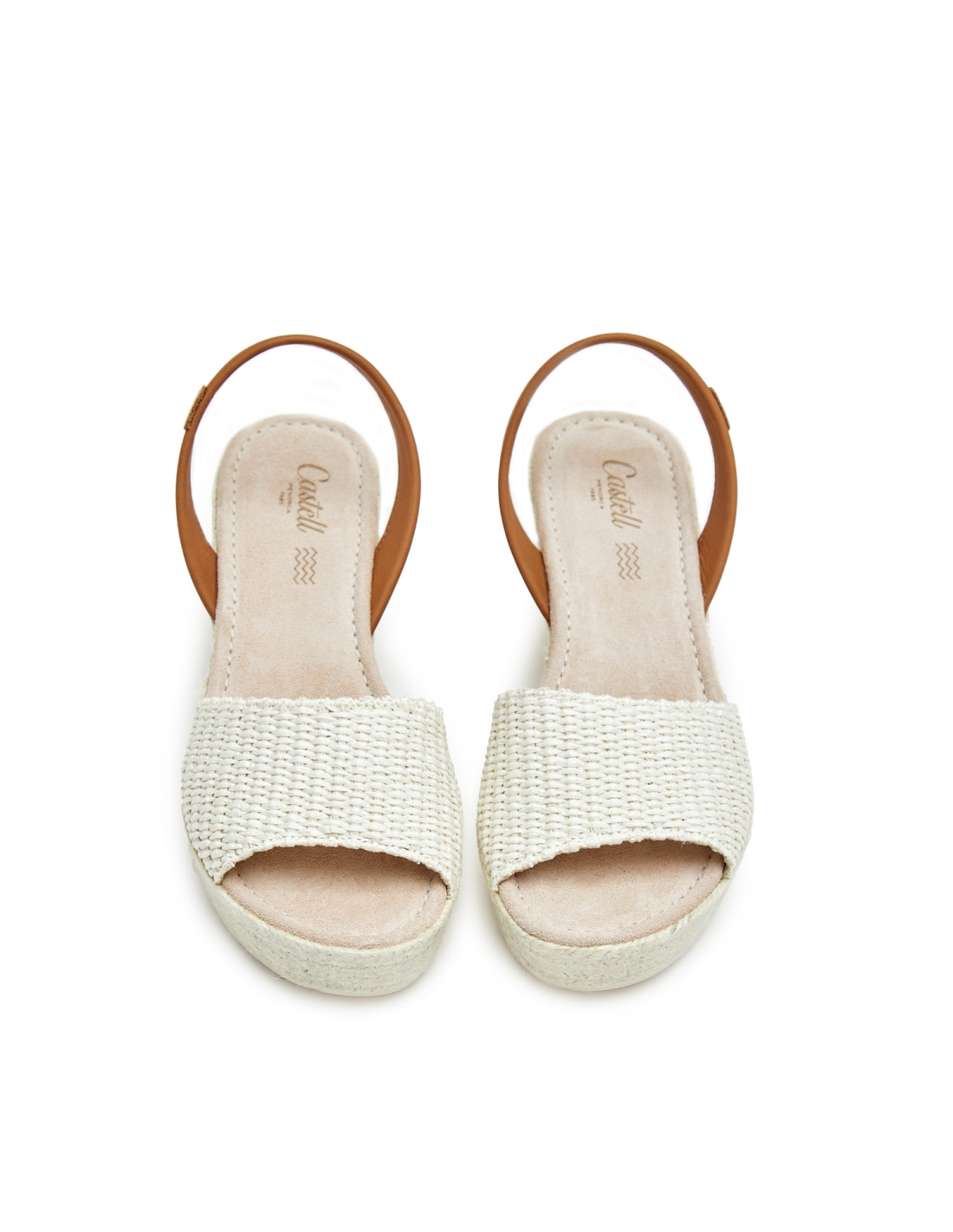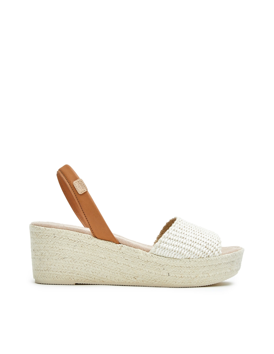 Sandalia cuña de rafia blanca con tira cuero y plantilla acolchada.