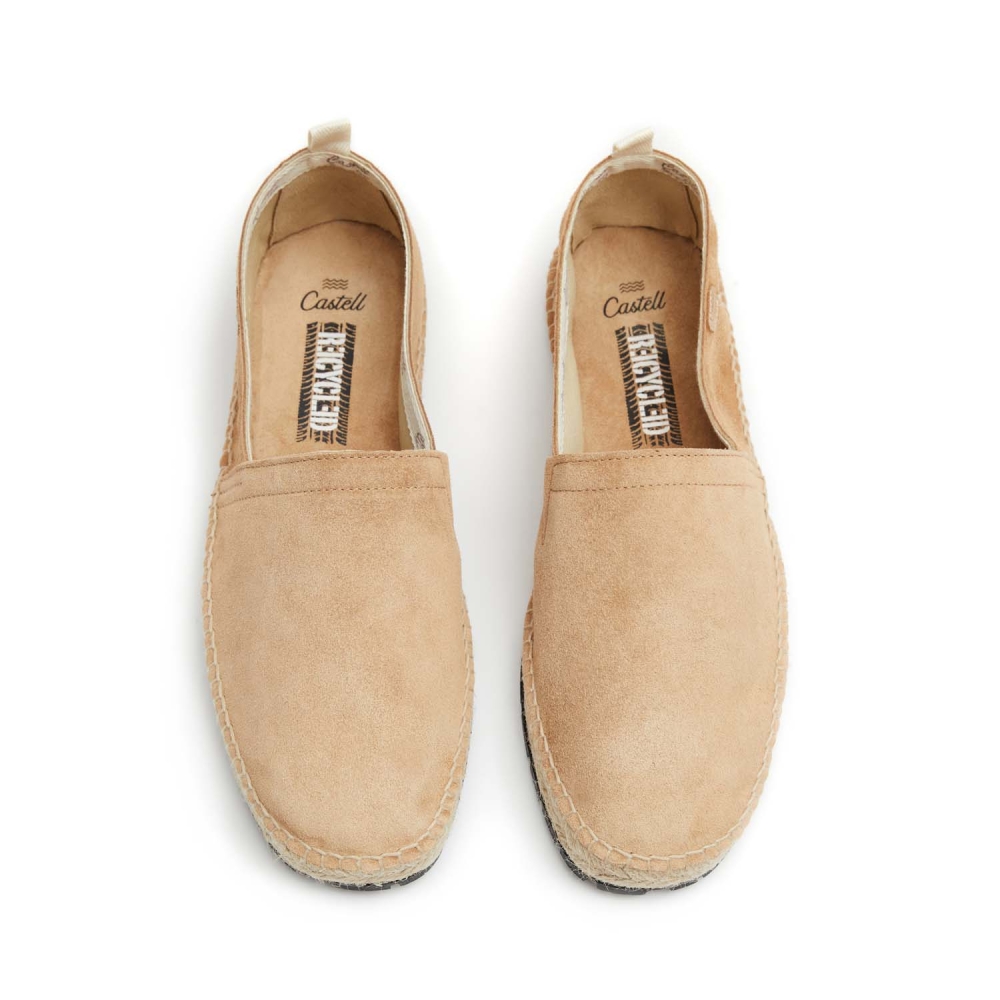 Alpargata Recycled Hombre con yute y neumático reciclado. Fabricación elaborada con serraje italiano de primera calidad, forrada con piel y acabado interior con cinta de algodón con el logo de Castell. Plantilla acolchada de serraje. Piso de neumático reciclado.
