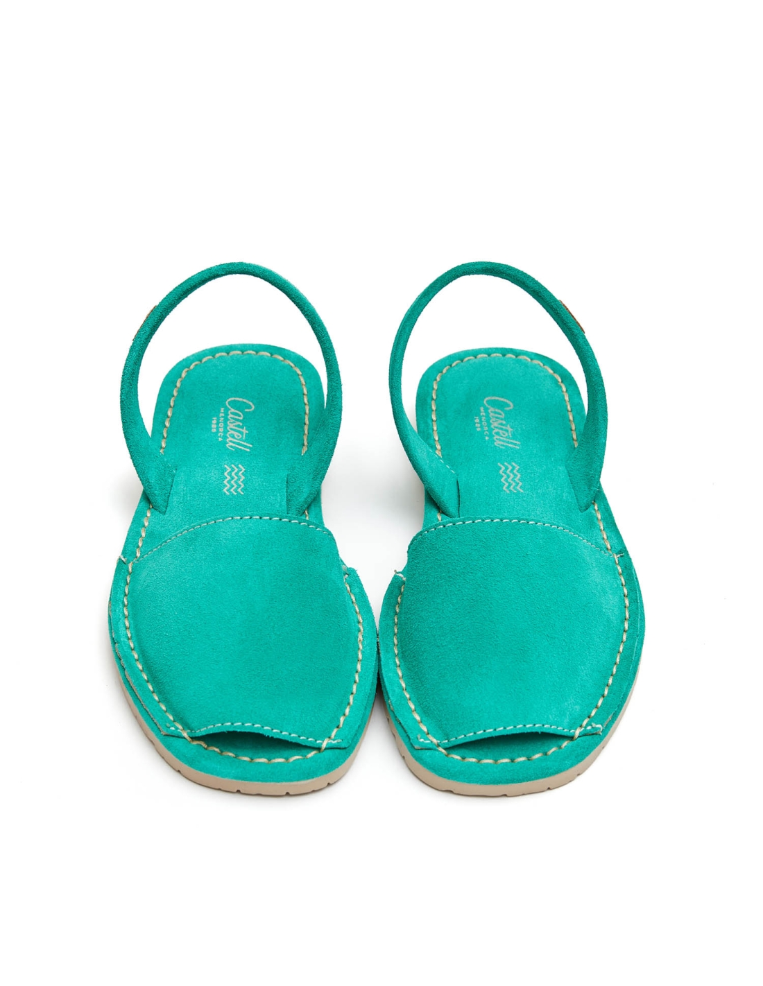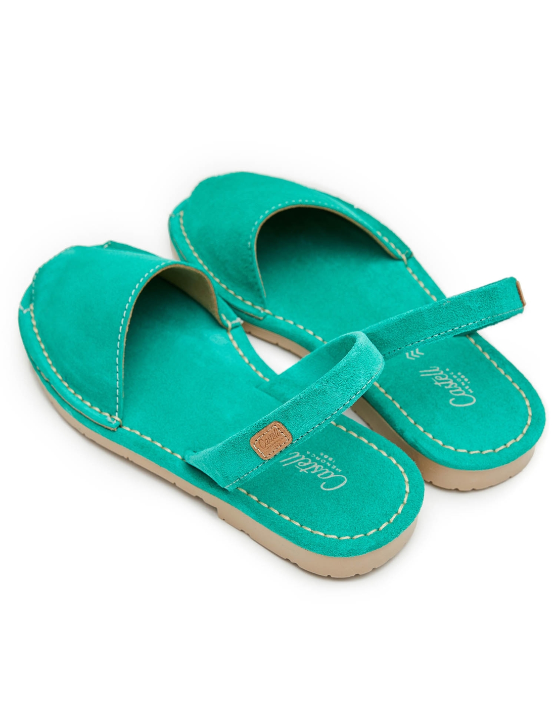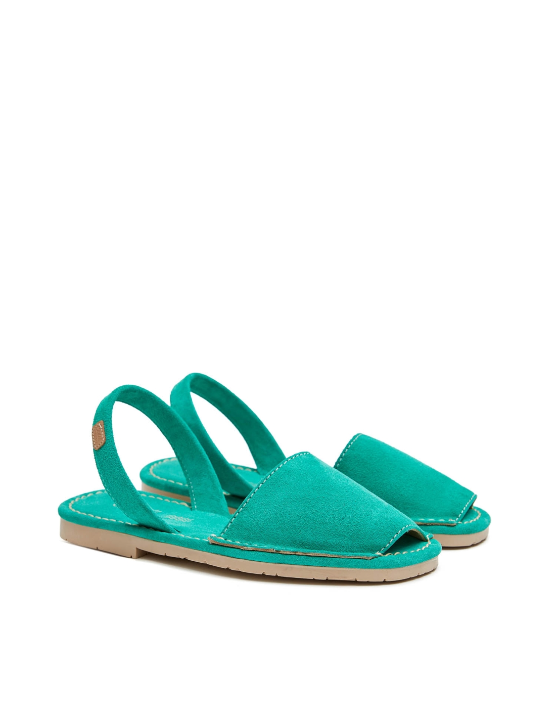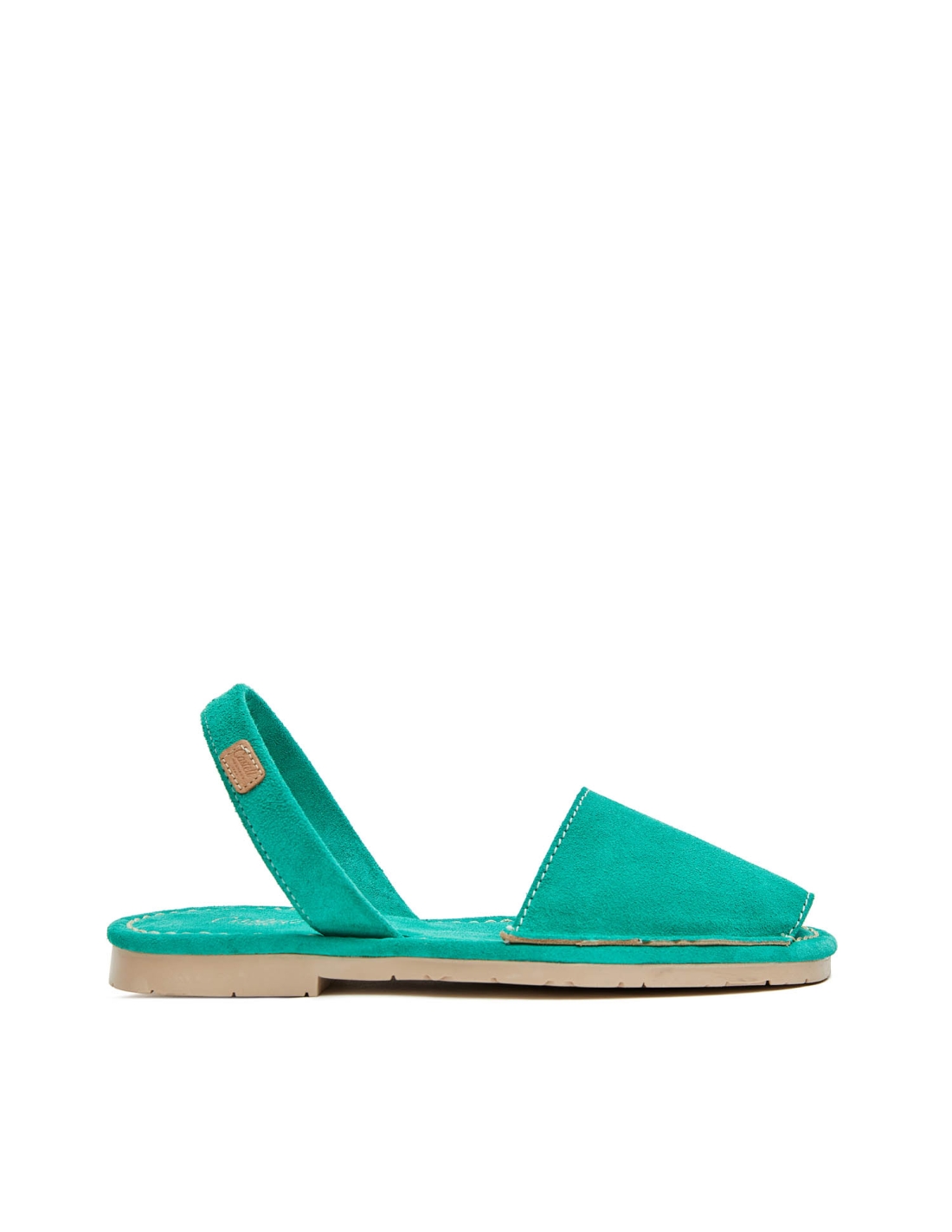 Abarca de serraje italiano de 1ª calidad con plantilla al tono y pala forrada de piel cosida en la plantilla de piel de serraje acolchada, suela de caucho de color marfil con una pequeña alza, altura de 1.5 cm.