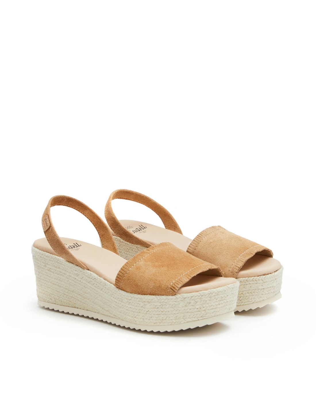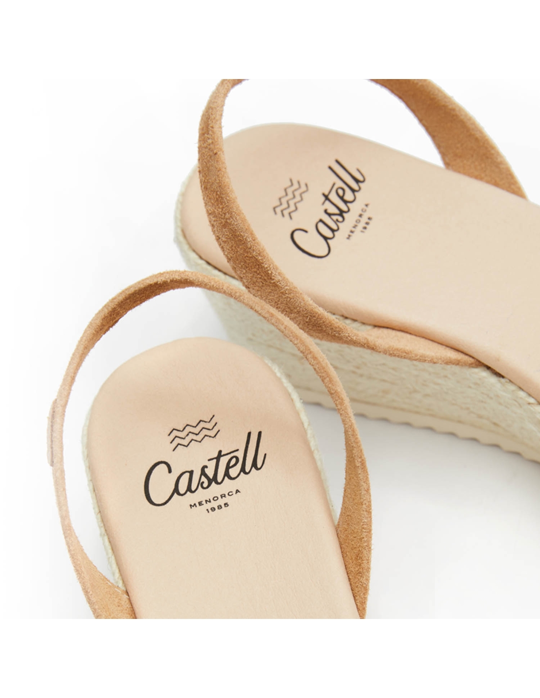 Abarca con cuña de yute de 6,5 cm de altura. Pala de serraje italiano de 1ª calidad, forrada y acabada en flequillo cosida con hilo al mismo tono que la piel. Plantilla acolchada y suela de goma color marfil. Este modelo, gracias al la forma y el flequillo, tiene un calce más ancho que el resto de sandalias Castell, ideal para pies normales o un poco más anchos.